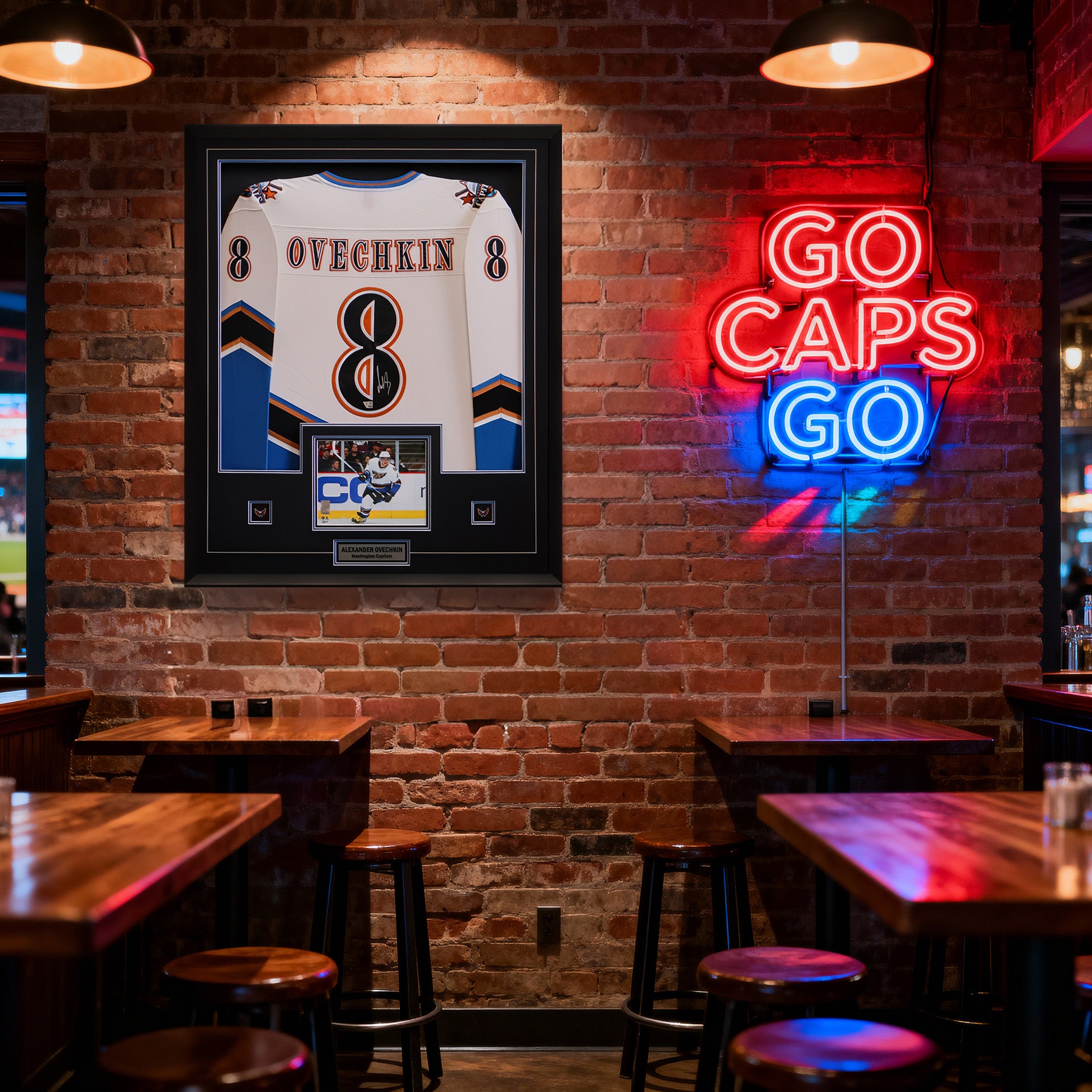 This Alexander Ovechkin Washington Capitals jersey with name and numbers professionally sewn on comes personally autographed by Alexander Ovechkin before being professionally framed. This jersey framed jersey is officially licensed by the NHL and NHLPA and comes with a certificate of authenticity and hologram from Fanatics to ensure authenticity. Signatures may vary. Made in Canada. Jersey size may vary.. Finished Size: 34 x 42"