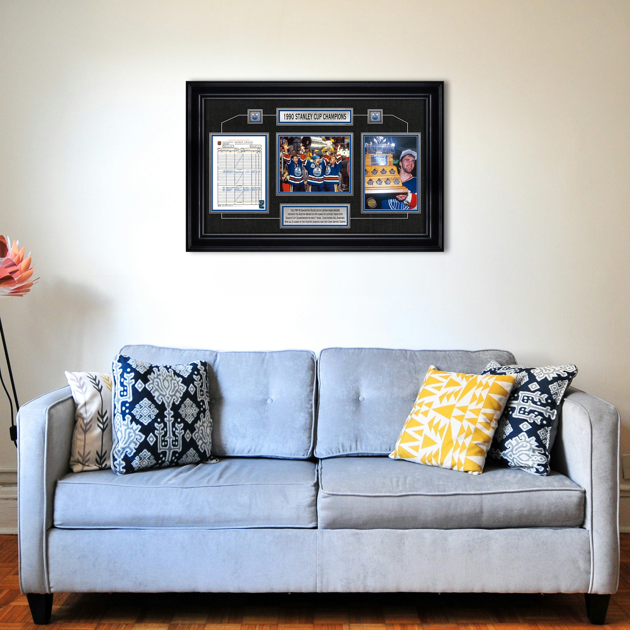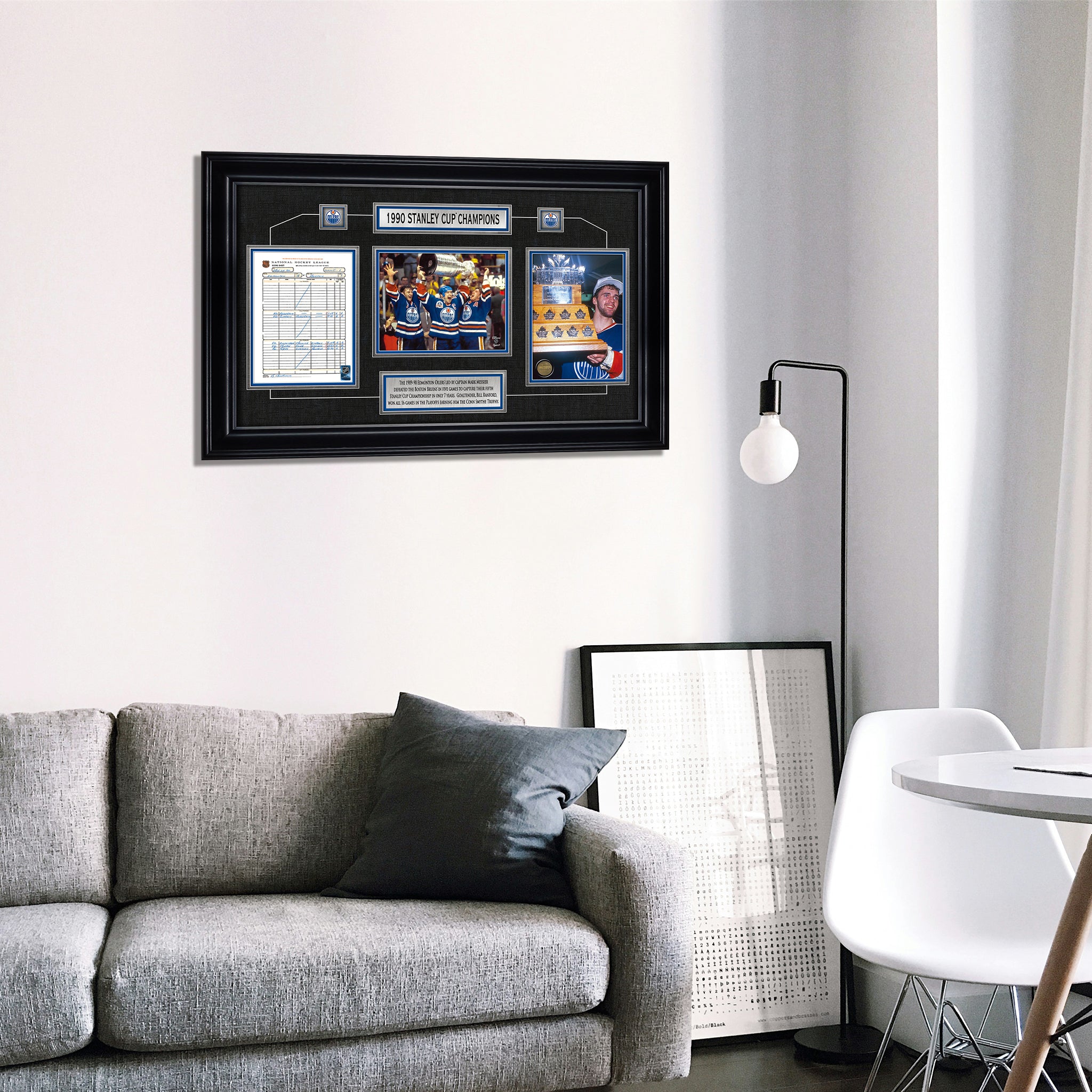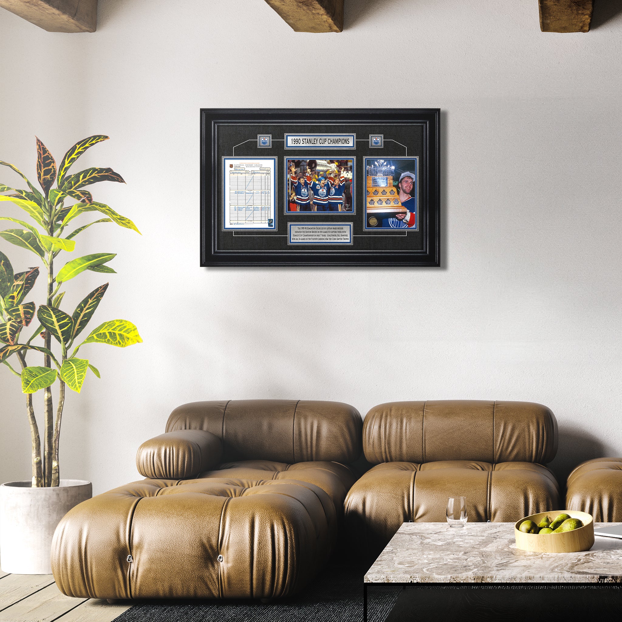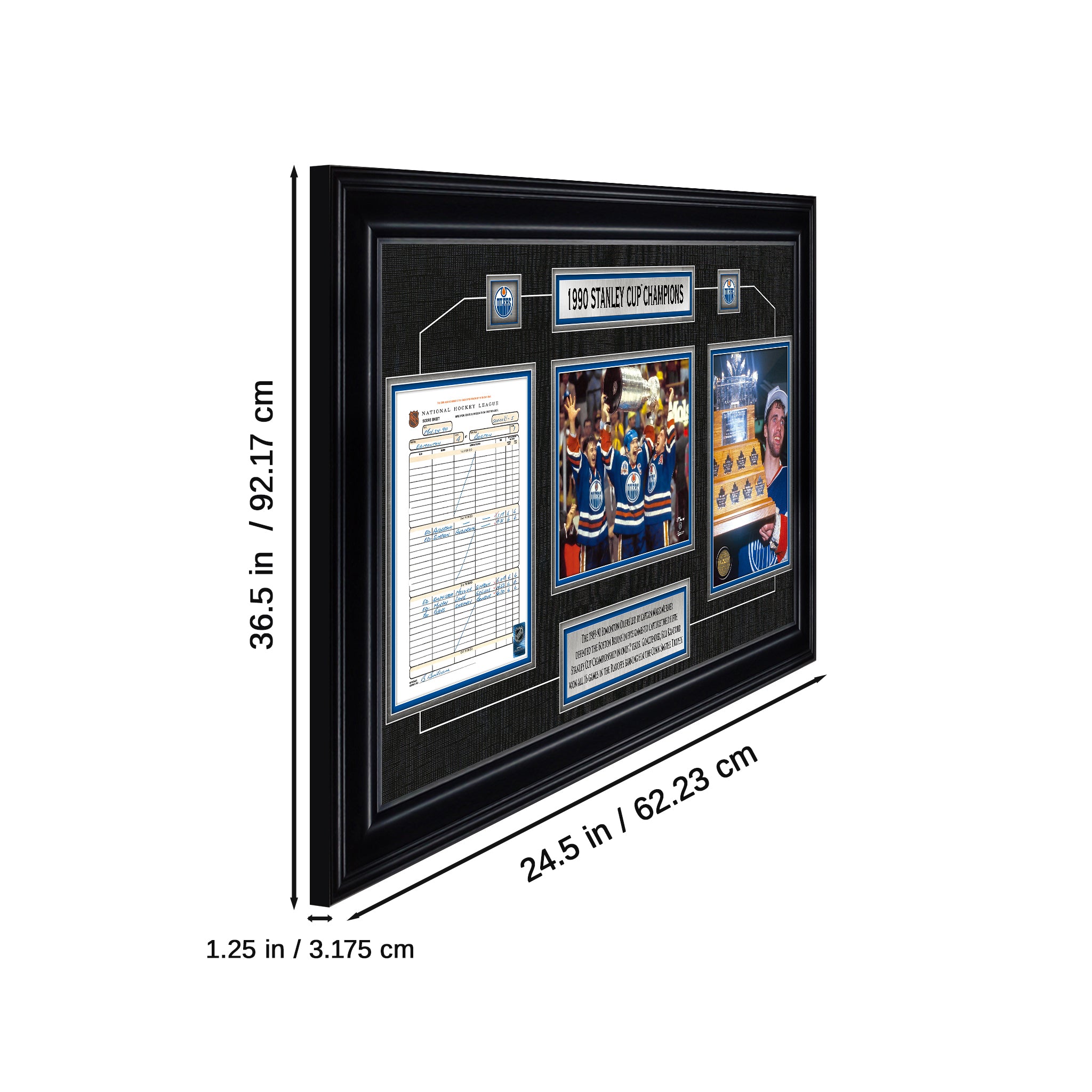 This commemorative 1989-90 Stanley Cup frame showcases two 8x10" photos, and an exact NHL licensed replica copy of the scoresheet from the final game. The descriptive metal plate at the bottom of the frame recaps the glory of the championship and reads the following: "The 1989-90 Edmonton Oilers' led by captain Mark Messier defeated the Boston Bruins' in five games to capture their fifth Stanley Cup in only 7 years. Goaltender, Bill Randford, won all 16 games in the playoffs earning him the Conn Smythe Trophy" The finished frame size is 25"x36"x1". The frames are a part of a four frame collection that showcases all of the most recent Stanley Cup victories for Canadian NHL franchises. The finished frame size is 25"x36"x1".