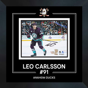 This image of Leo Carlsson is printed on high quality art canvas and then professionally stretched and framed. This canvas is officially licensed by the National Hockey League (NHL) and National Hockey League Players Association (NHLPA). Made in Canada.. Finished Size: 22.5 x 31.5"