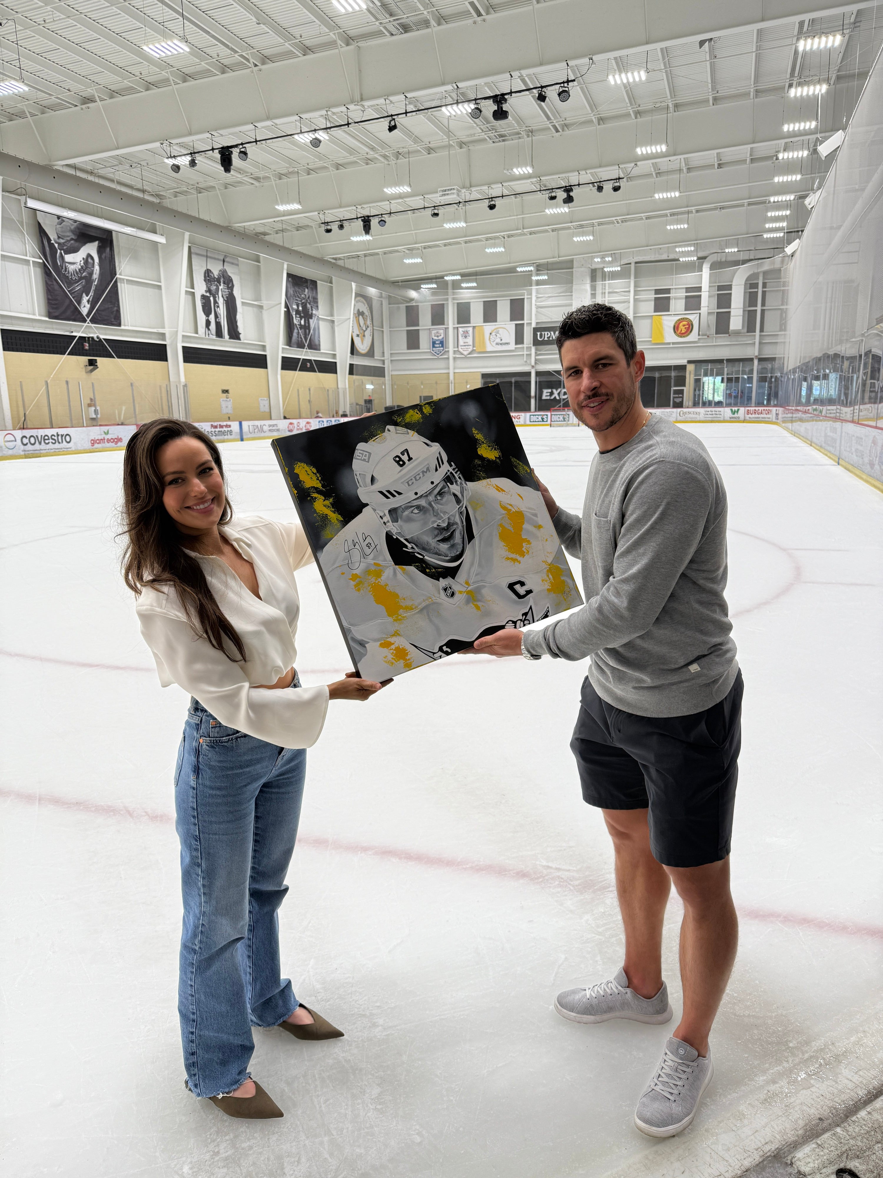 This exclusive original painting by renowned Pittsburgh artist Kait Schoeb captures the intensity and passion of hockey legend Sidney Crosby. Featuring a striking black and white portrait with artistic gold splatter accents, this piece represents the pinnacle of sports art and charitable giving.