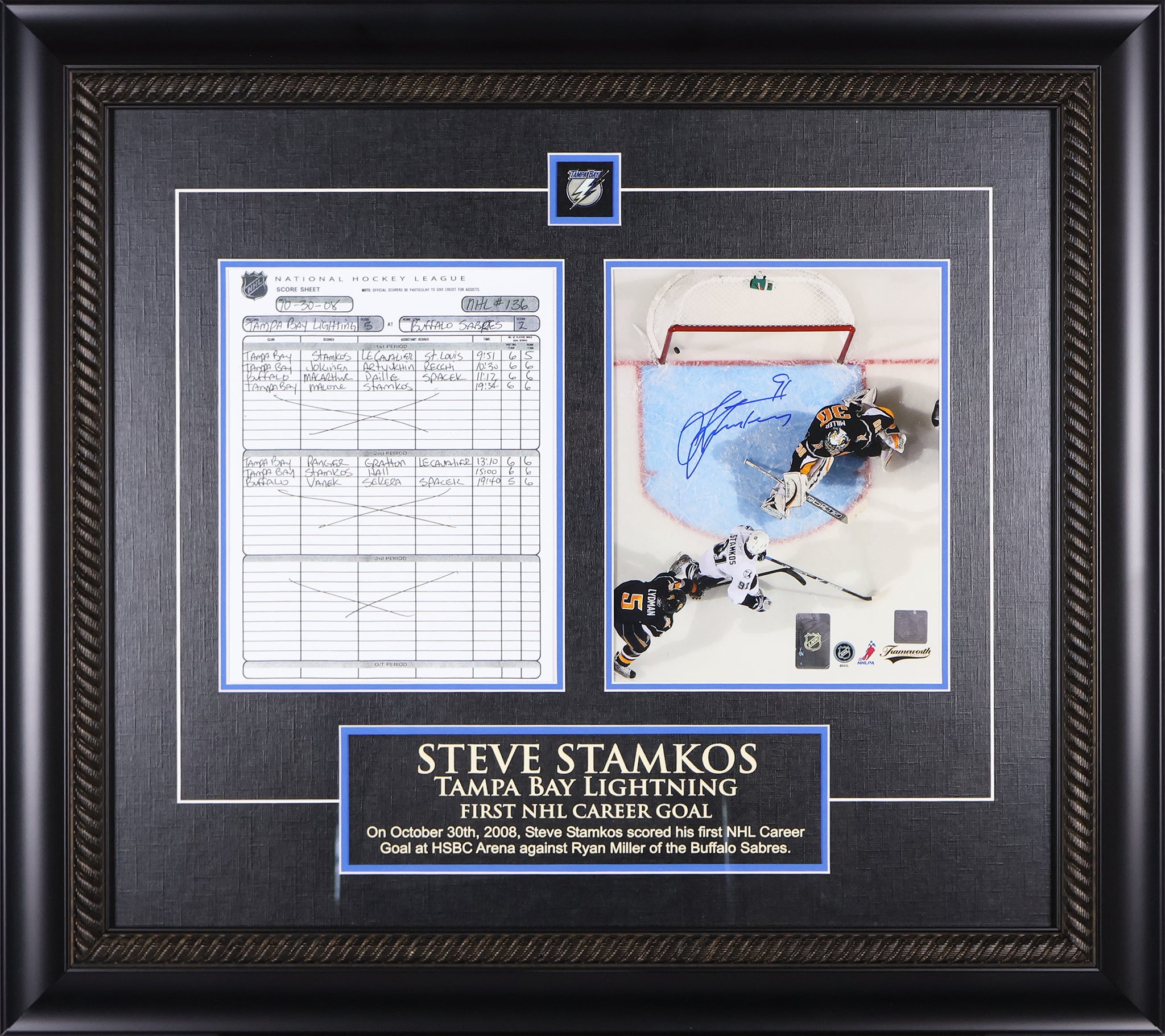 Steven Stamkos is one of the most prolific goal scorers of his generation, a two-time Stanley Cup champion and the all-time leading scorer in Tampa Bay Lightning history. His first career NHL goal marked the beginning of a legendary career that would see him become the face of the franchise and one of the most respected players in the game. This framed piece pairs his signed photo with the actual scoresheet from that historic night, creating a uniquely compelling piece of hockey memorabilia. A milestone moment, beautifully preserved.
