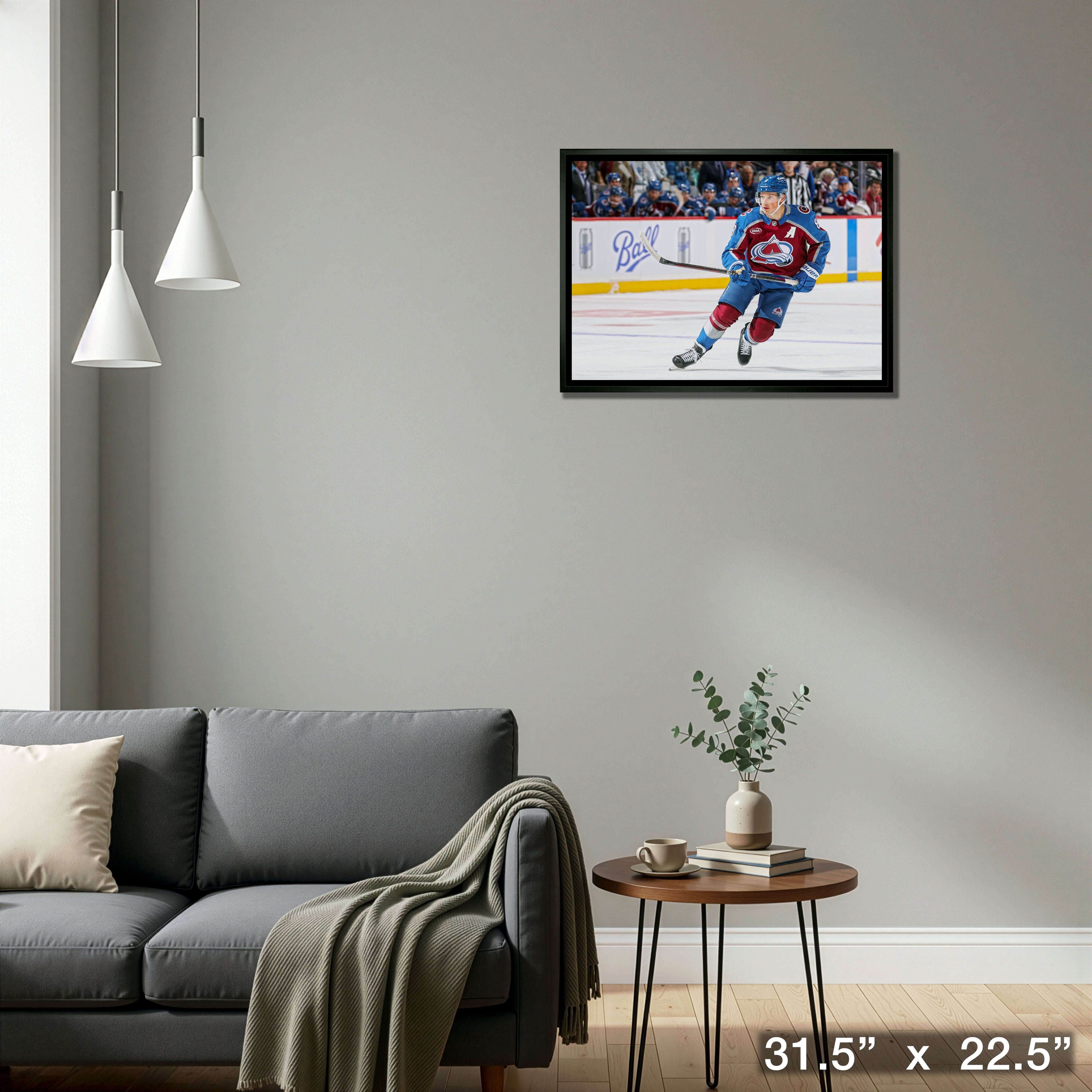 This image of Cale Makar is printed on high quality art canvas and then professionally stretched and framed. This canvas is officially licensed by the National Hockey League (NHL) and National Hockey League Players Association (NHLPA). Made in Canada.. Finished Size: 31.5 x 22.5"