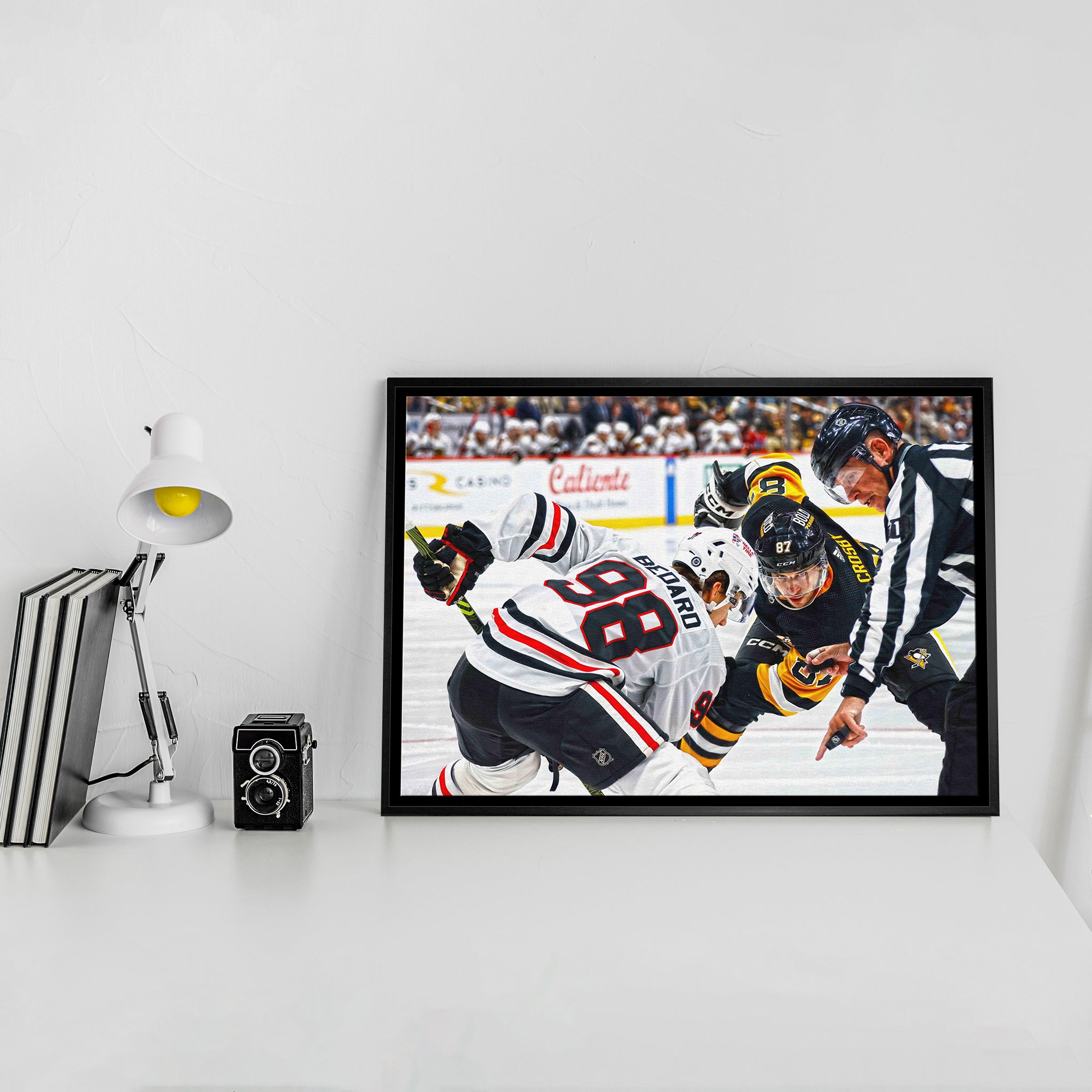 Connor Bedard 20x29 Framed Canvas Blackhawks vs Crosby is backordered and will ship as soon as it is back in stock.