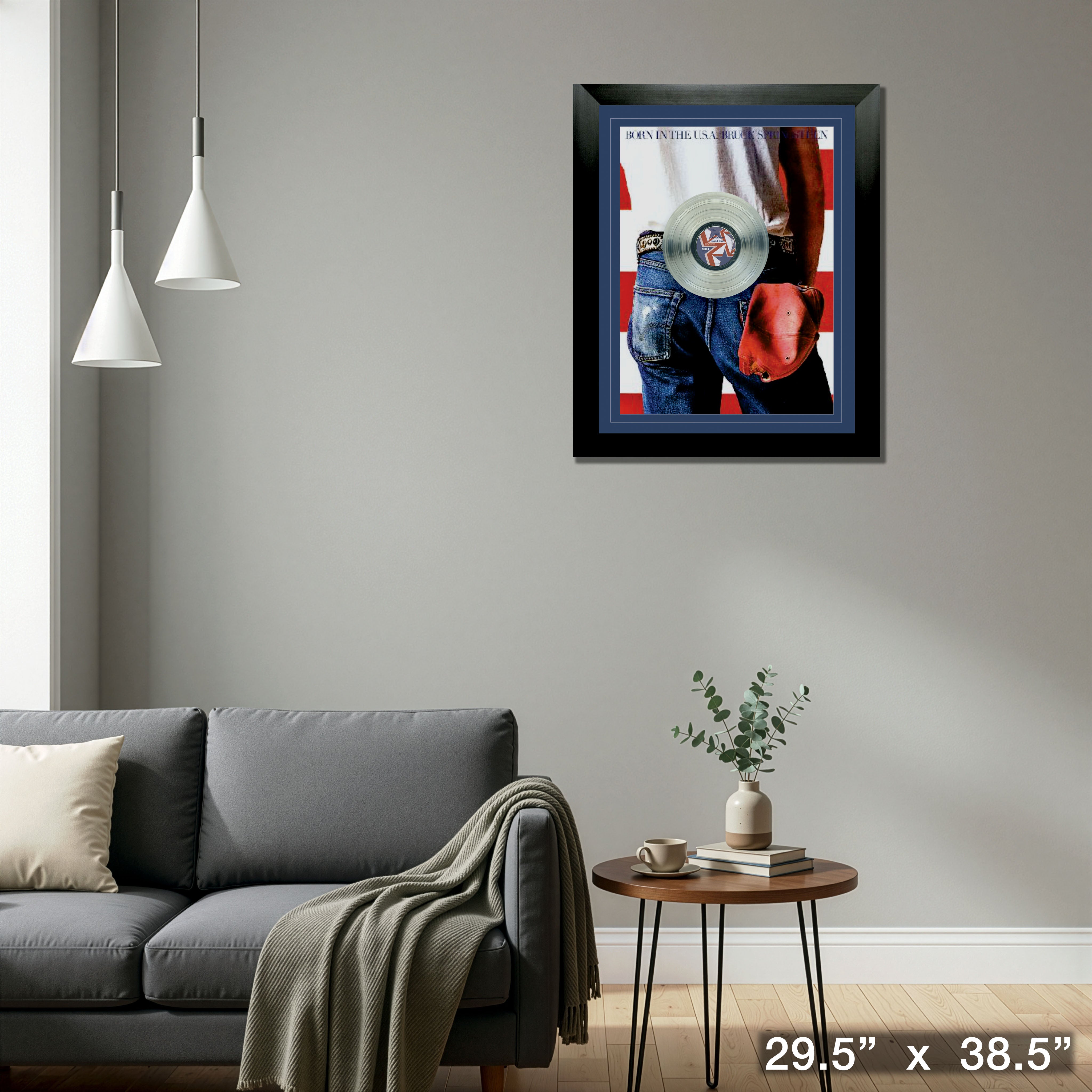 This framed poster is a 24x36 print of Bruce Springsteen's Album cover for his Born In The USA album. The poster has been elegantly and professionally framed by Frameworth. Born in the USA is by far the most popular album that Springsteen has produced having sold over 15 million copies in the U.S.A and over 30 million copies worldwide. This frame is the perfect way to celebrate "The Boss", as in addition to featuring the iconic album art, this frame also has a replica platinum LP inlayed into the foreground. Approximate Finished Size: 29.5 x 38.5"