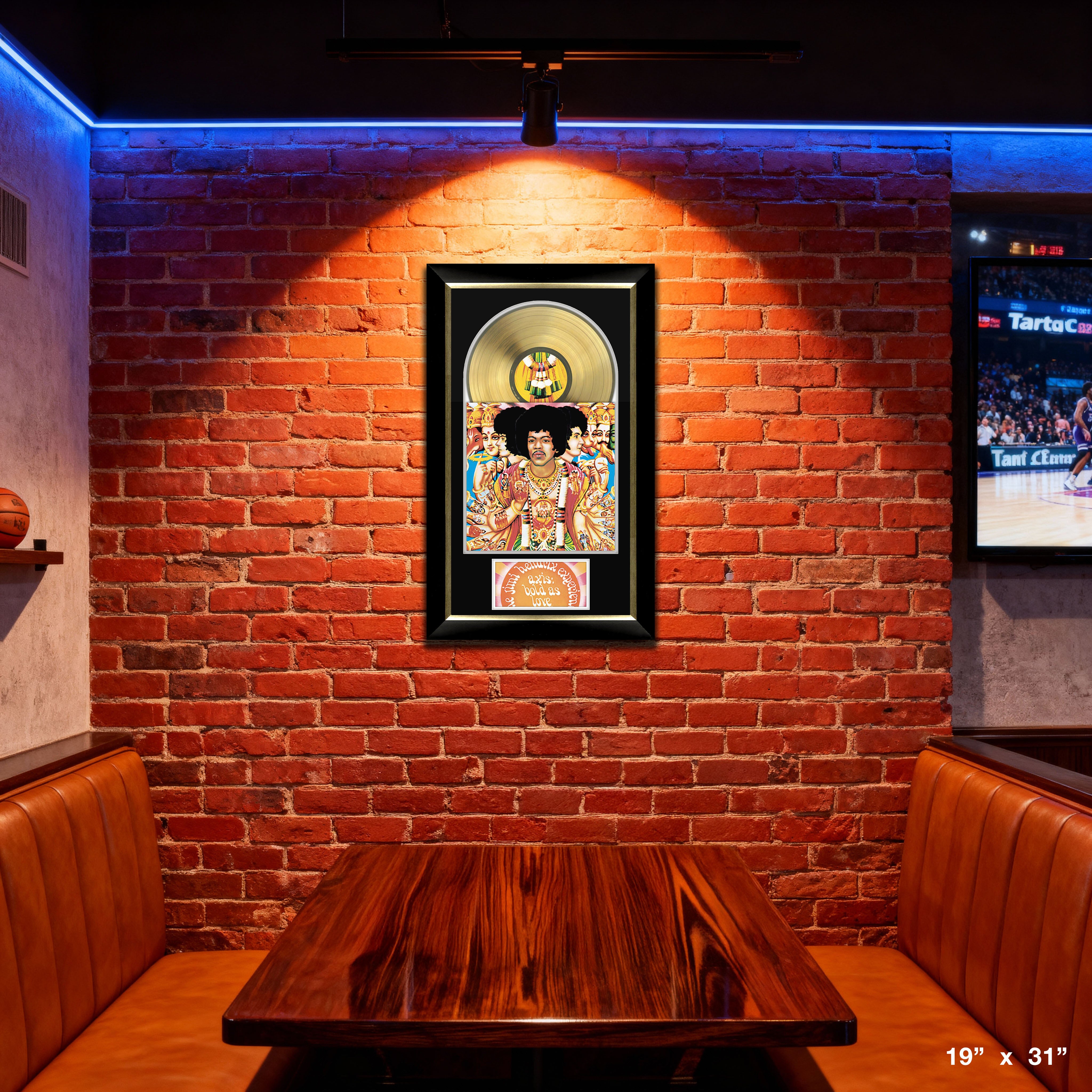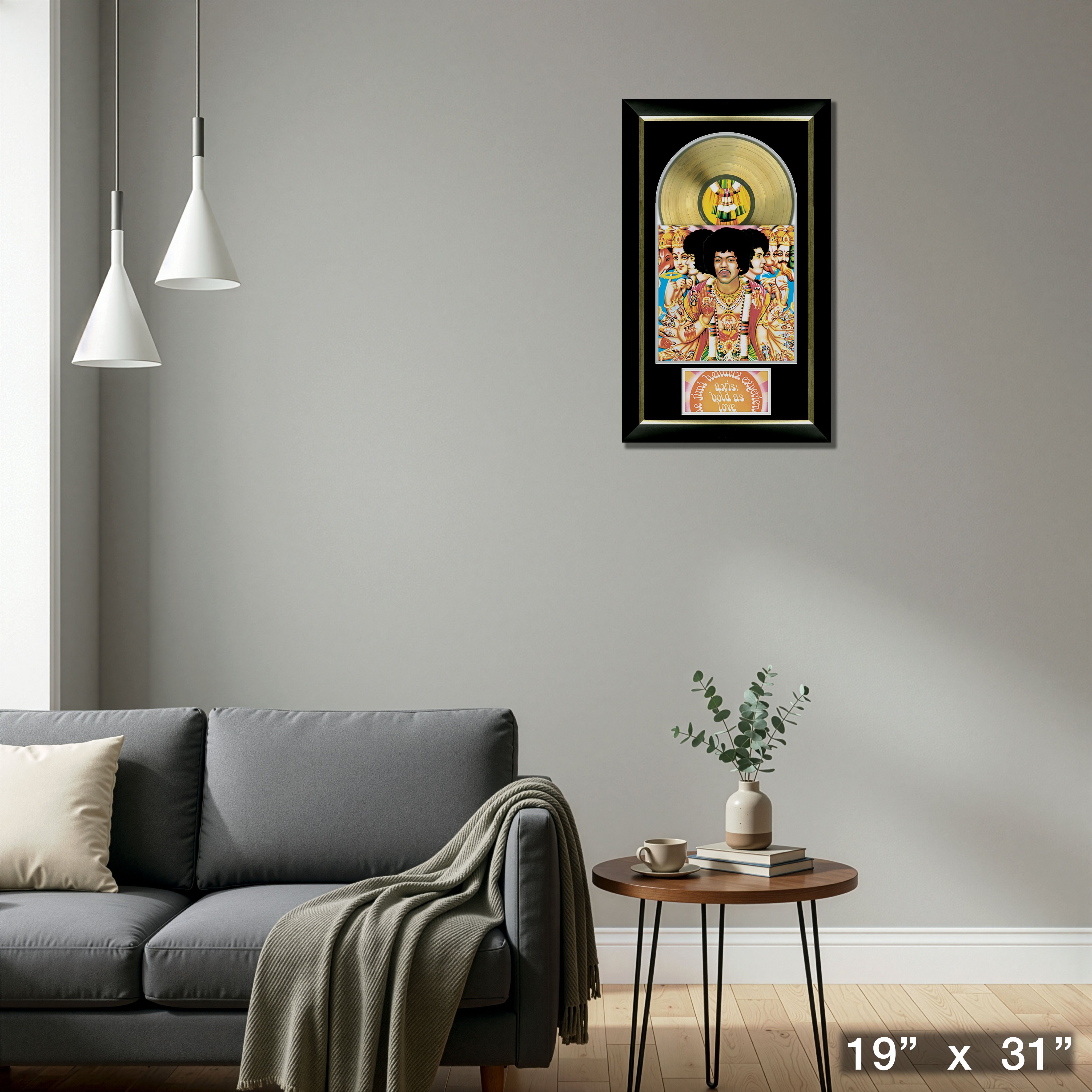 Jimi Hendrix Bold As Love Music Cover framed poster featuring a gold vinyl replica in a 19x31 vertical layout. A must-have tribute to iconic music history. Made in Canada.