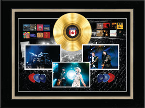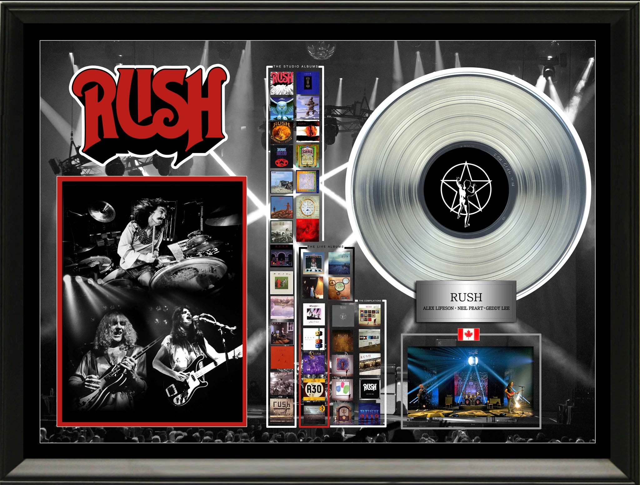 This Rush print has been set in Frameworth's renowned framing along with a platinum LP and descriptive plate. This frame features a collage of the band's album covers and photos of Geddy Lee, Alex Lifeson and Neil Peart . Rush was active from 1968 - 2018 (arriving at their present-day trio in 1974), and has been awarded with 24 gold, 14 platinum and 3 multi-platinum albums. The band was inducted into the Canadian Music Hall of Fame in 1994 and the Rock and Roll Hall of Fame in 2013. Perfect for any fan! Actual Product may vary slightly from image. Finished Size: 34 x 26"