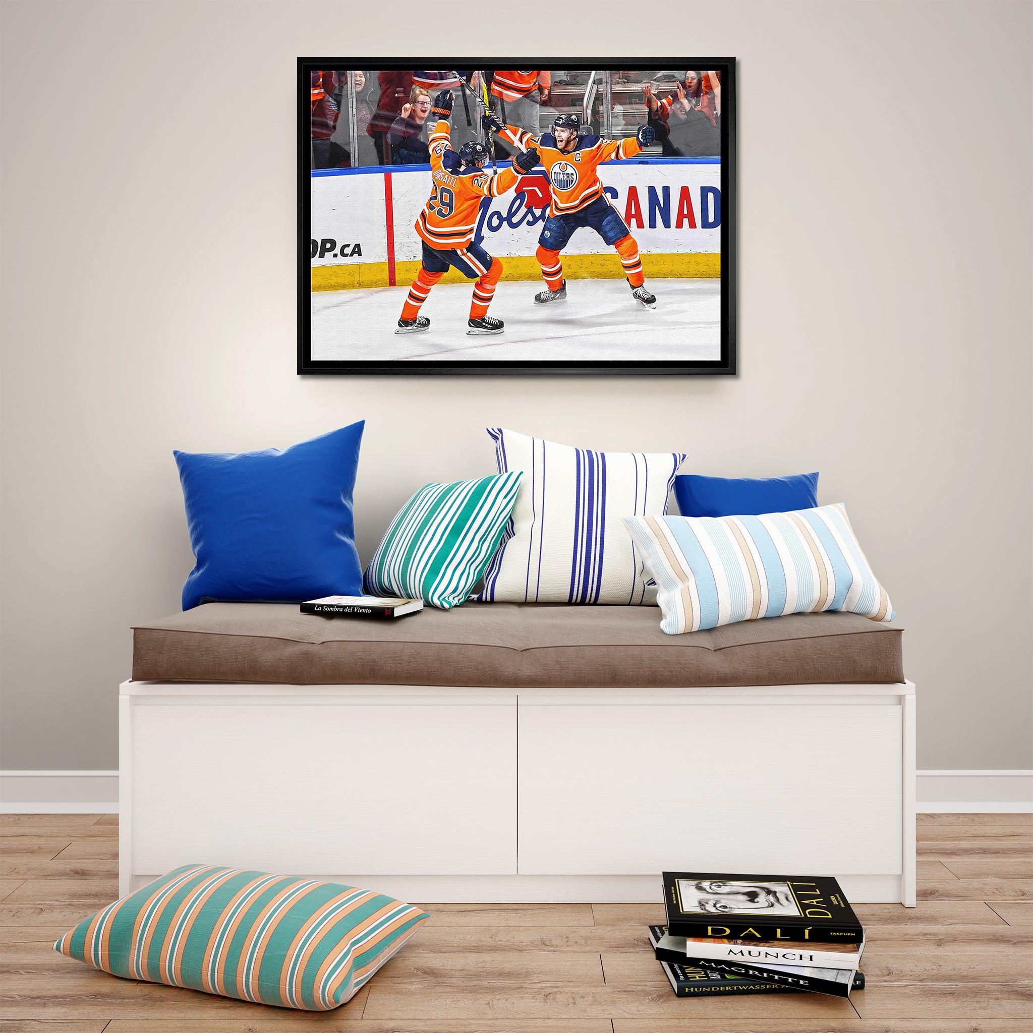 Frozen mid-celebration, this framed canvas captures the electric rush as Leon Draisaitl and Connor McDavid collide in a triumphant moment — vivid arena lights, textured ice, and the roar of the crowd rendered with gallery-grade clarity.