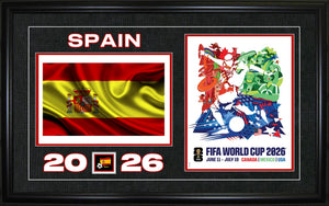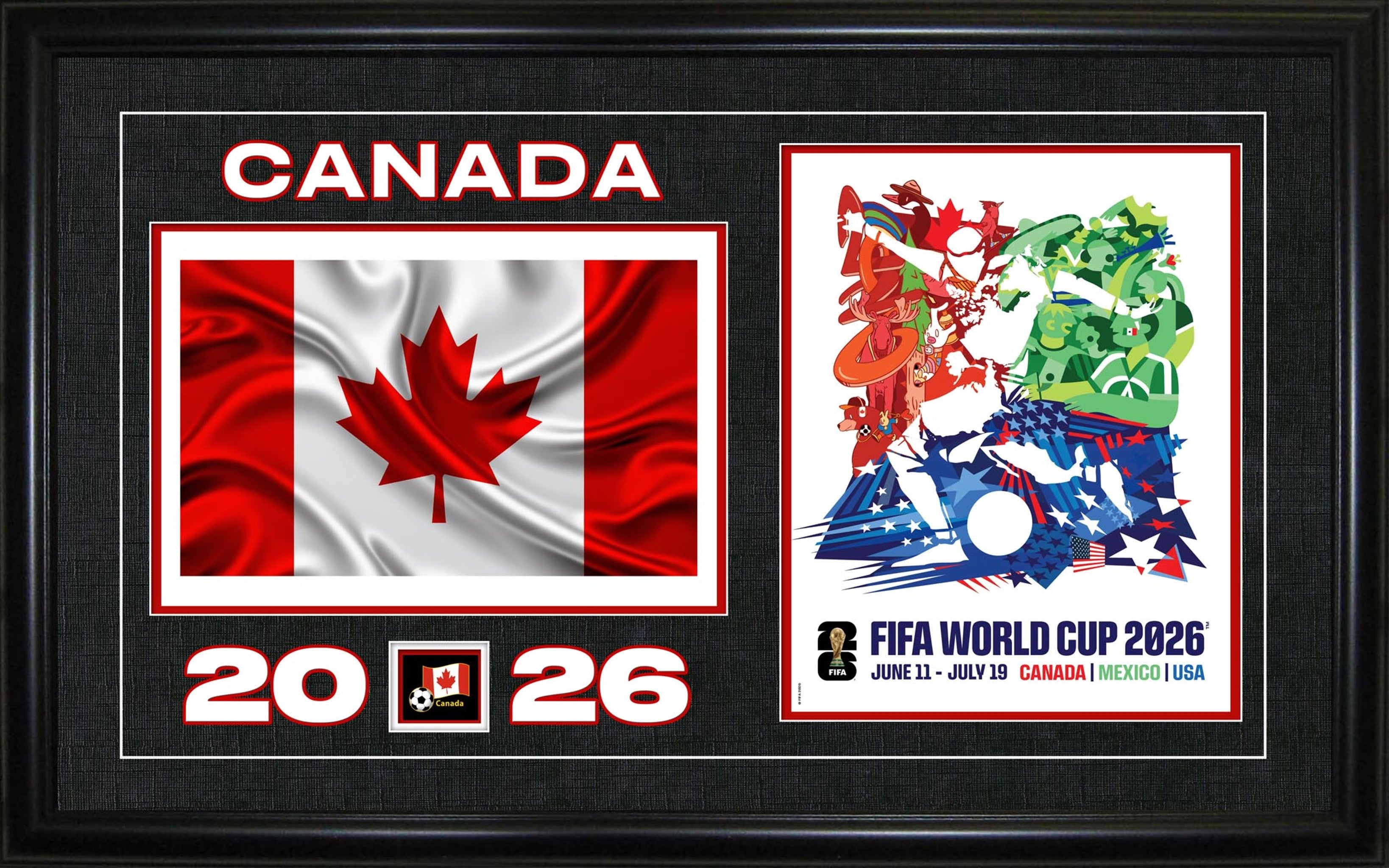 This 15x24" display features the Canada national flag alongside FIFA World Cup 2026 artwork in a Frameworth-designed collage layout, presented in a premium black frame with custom matting. A perfect tribute as Canada co-hosts the tournament for the first time in history.