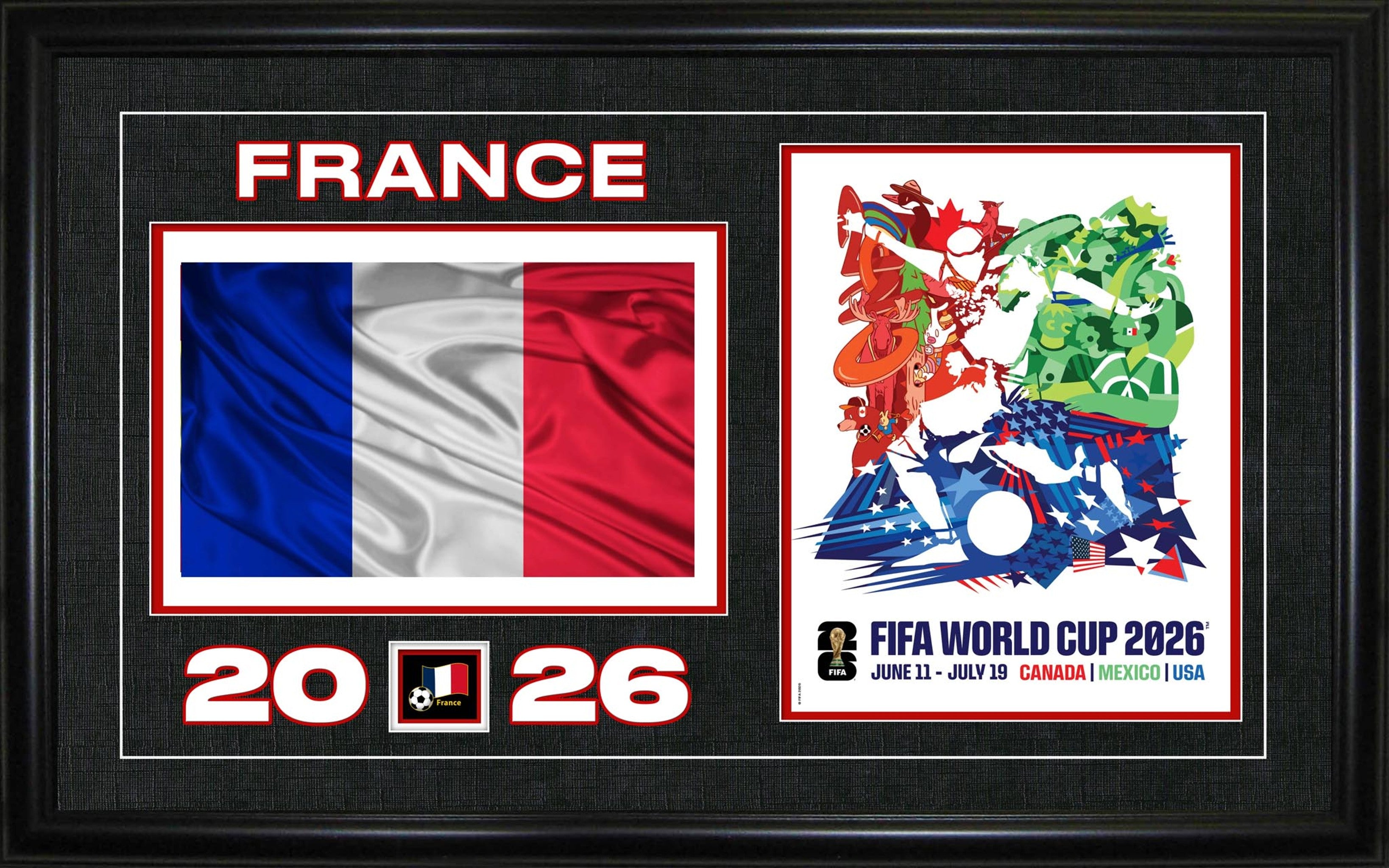This 15x24" display features the France national flag alongside FIFA World Cup 2026 artwork in a Frameworth-designed collage layout, presented in a premium black frame with custom matting. A perfect tribute as the 2018 champions return to defend their legacy.