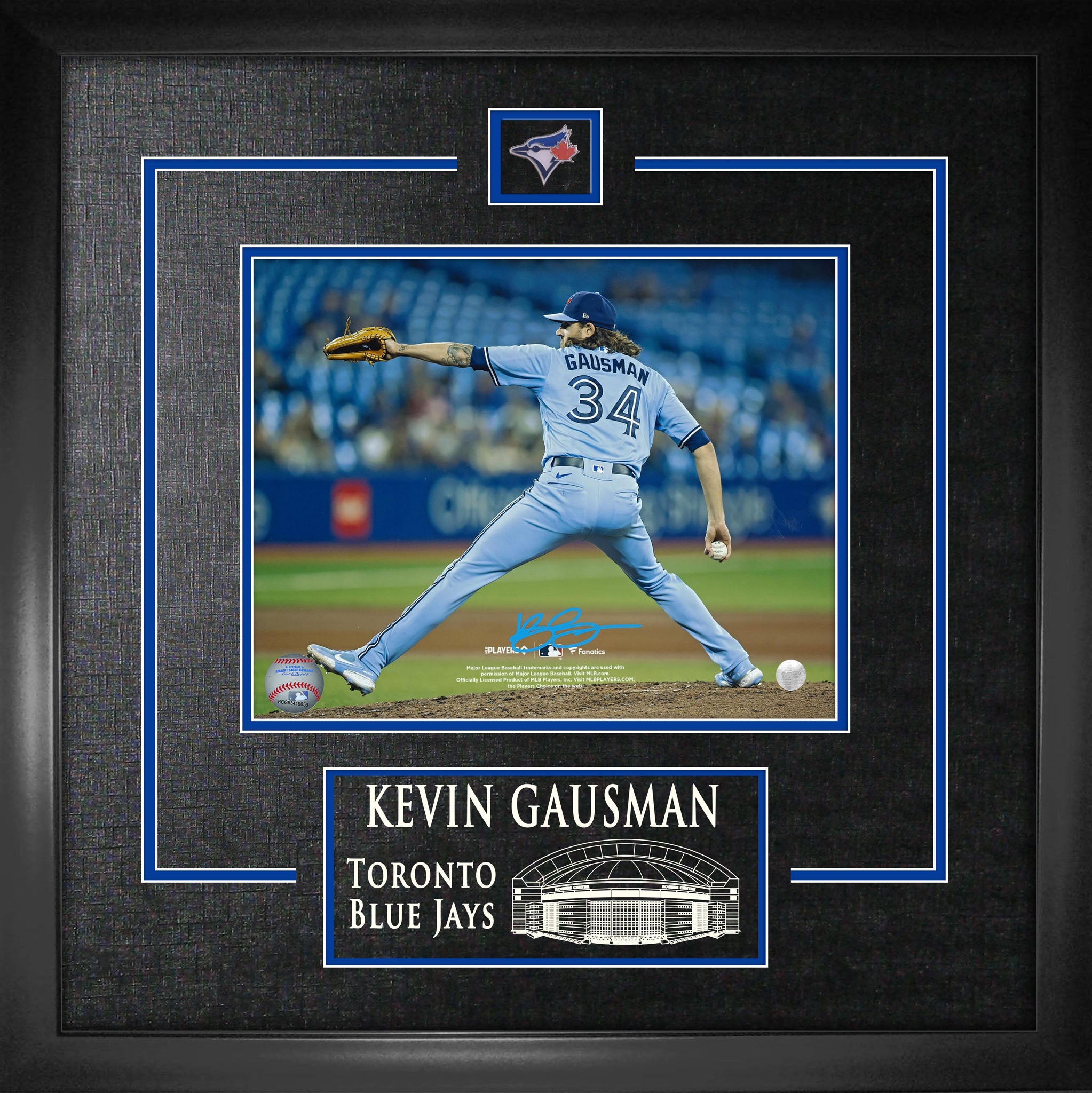 Kevin Gausman captured mid-delivery in a striking action back-view photograph, presented with layered matting and a museum-style etched nameplate that highlights the Toronto Blue Jays insignia and stadium engraving.