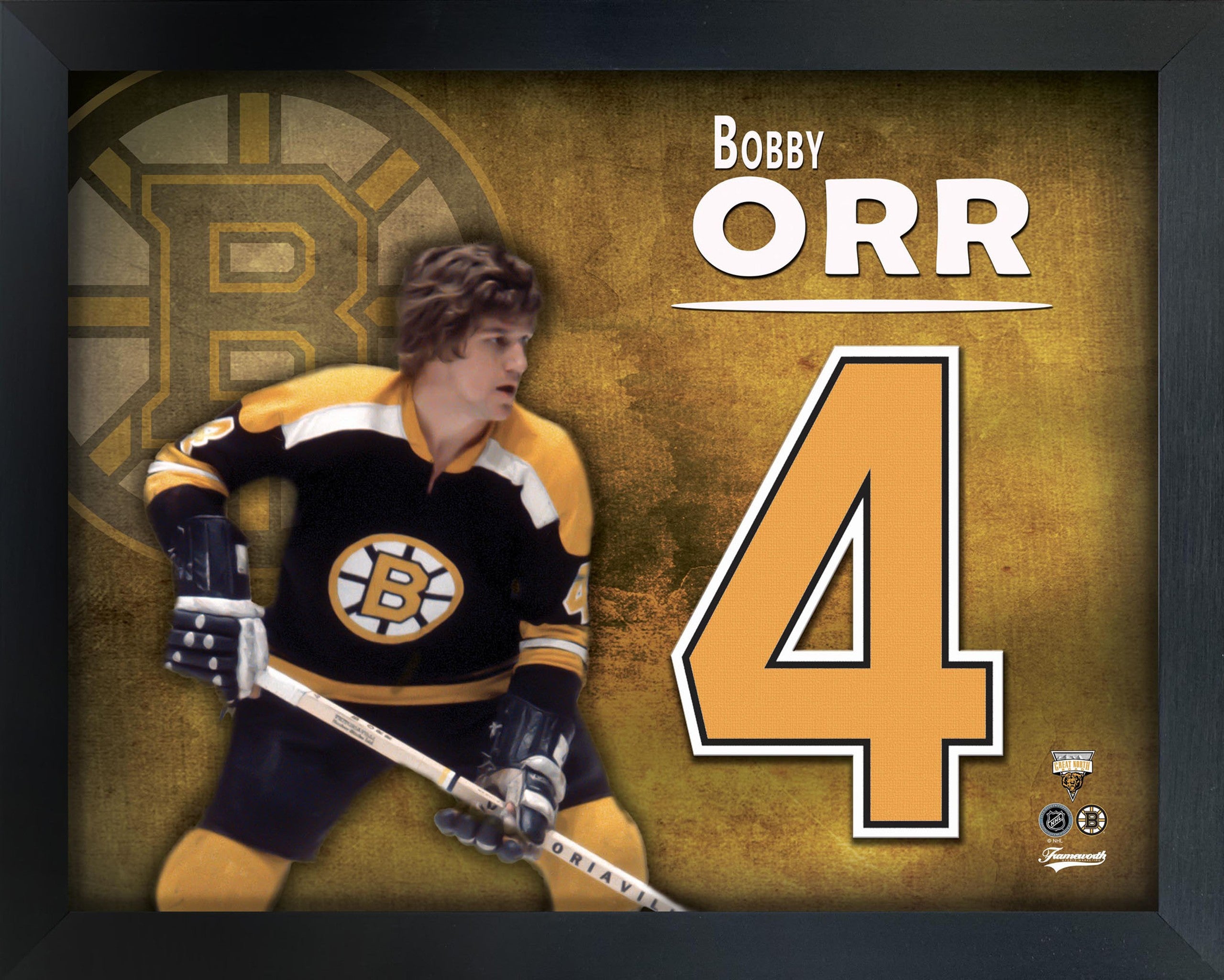 This image of Bobby Orr is printed on high quality photo paper and then professionally framed. This print is officially licensed by the National Hockey League (NHL) . Made in Canada. Finished Size: 16x20"