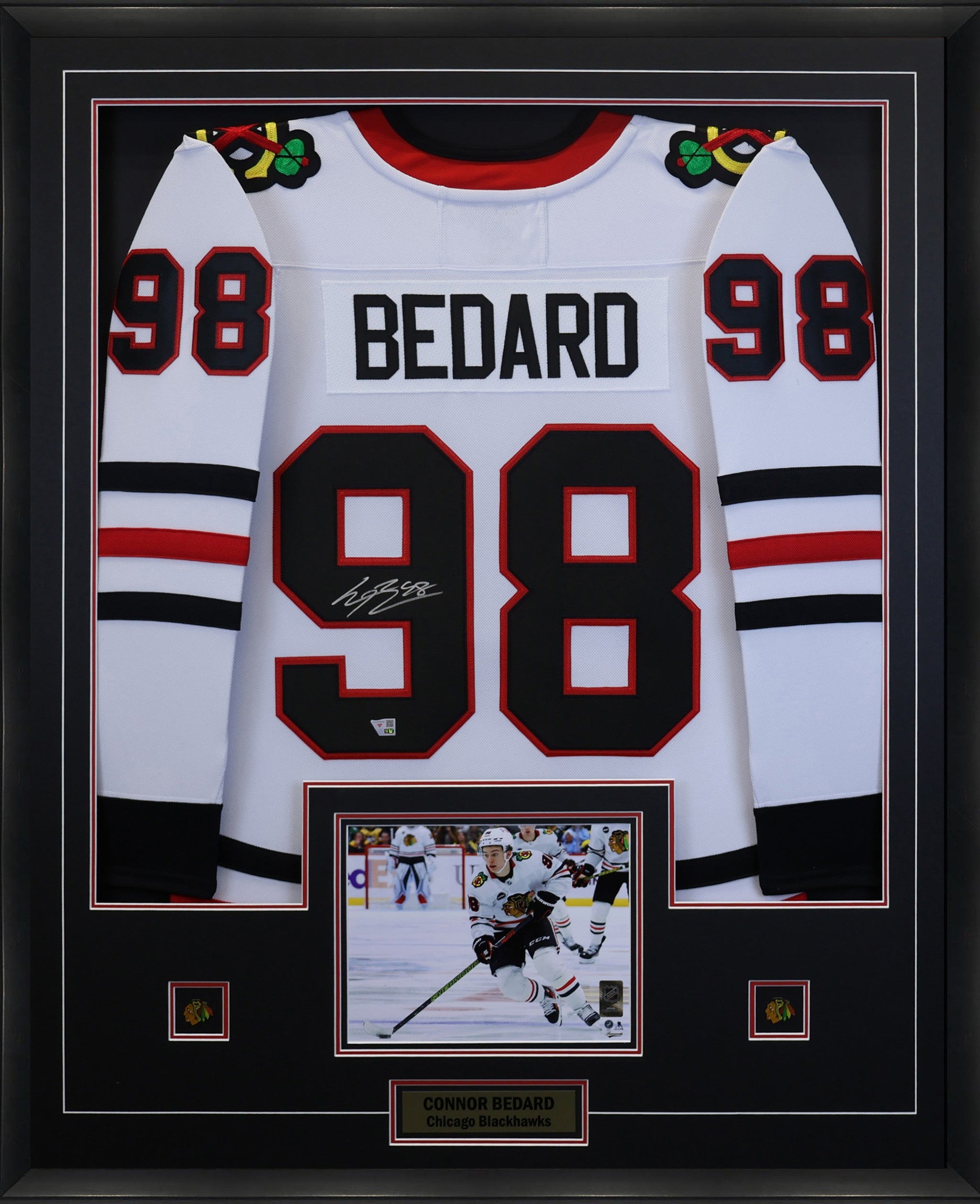 Connor Bedard Signed Framed 34x42 Chicago Blackhawks Away Fanatics Breakaway Jersey