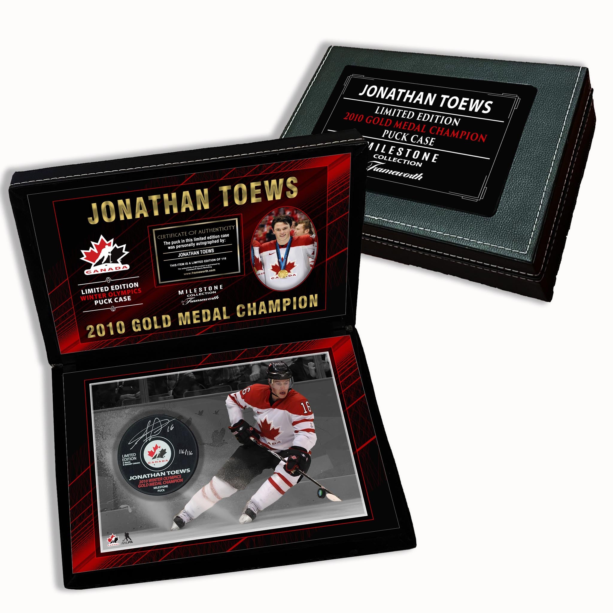 Jonathan Toews Signed Puck 2010 Gold Medal Champion Team Canada in a Deluxe Case (Limited Edition of 116)