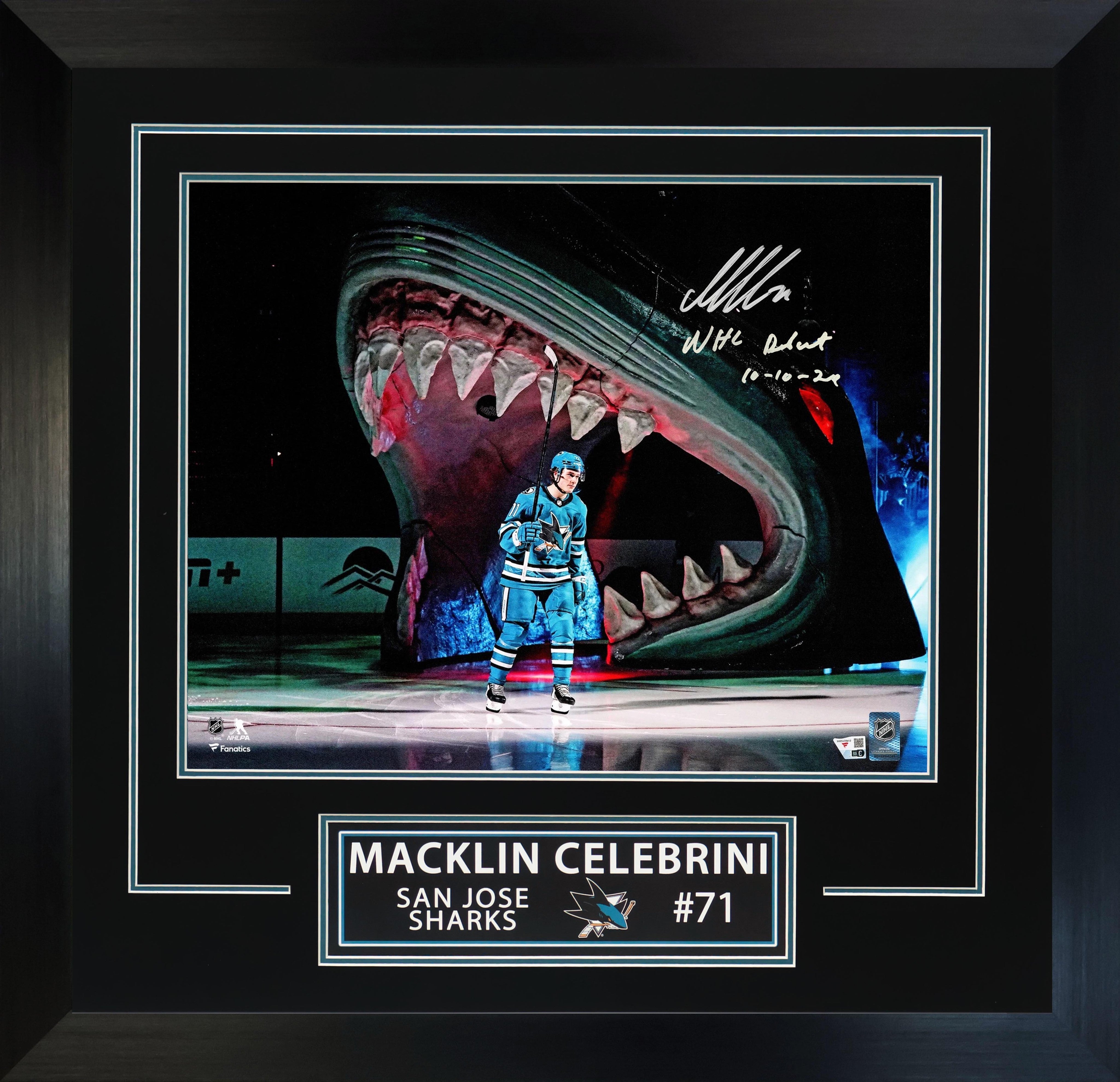 Macklin Celebrini Signed 16x20 Photo Framed San Jose Sharks NHL Debut with "NHL Debut 10-10-24" Inscription