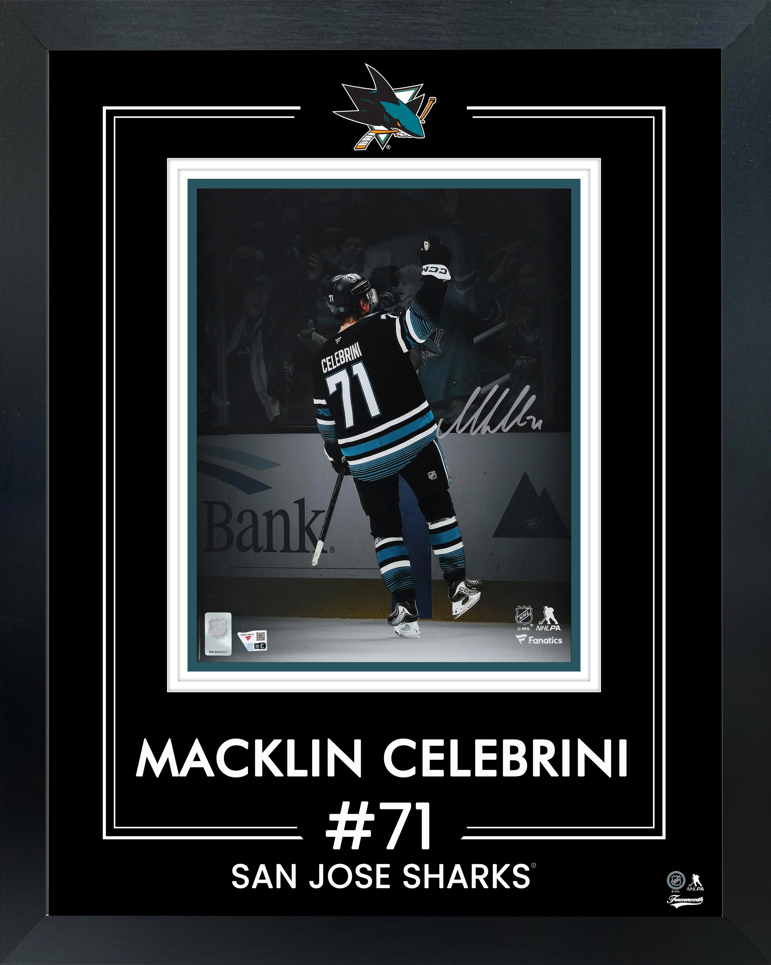 Macklin Celebrini Signed 8x10 Photo Framed PhotoGlass San Jose Sharks Black Alternate Jersey Celebration Spotlight
