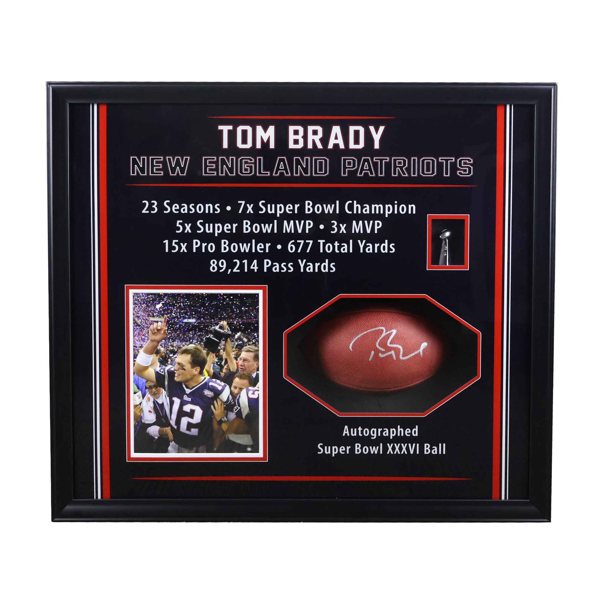 This framed display features a Tom Brady signed New England Patriots Superbowl 36 football. Comes with a certificate of authenticity from Fanatics to ensure authenticity. Finished Size: 30x26"
