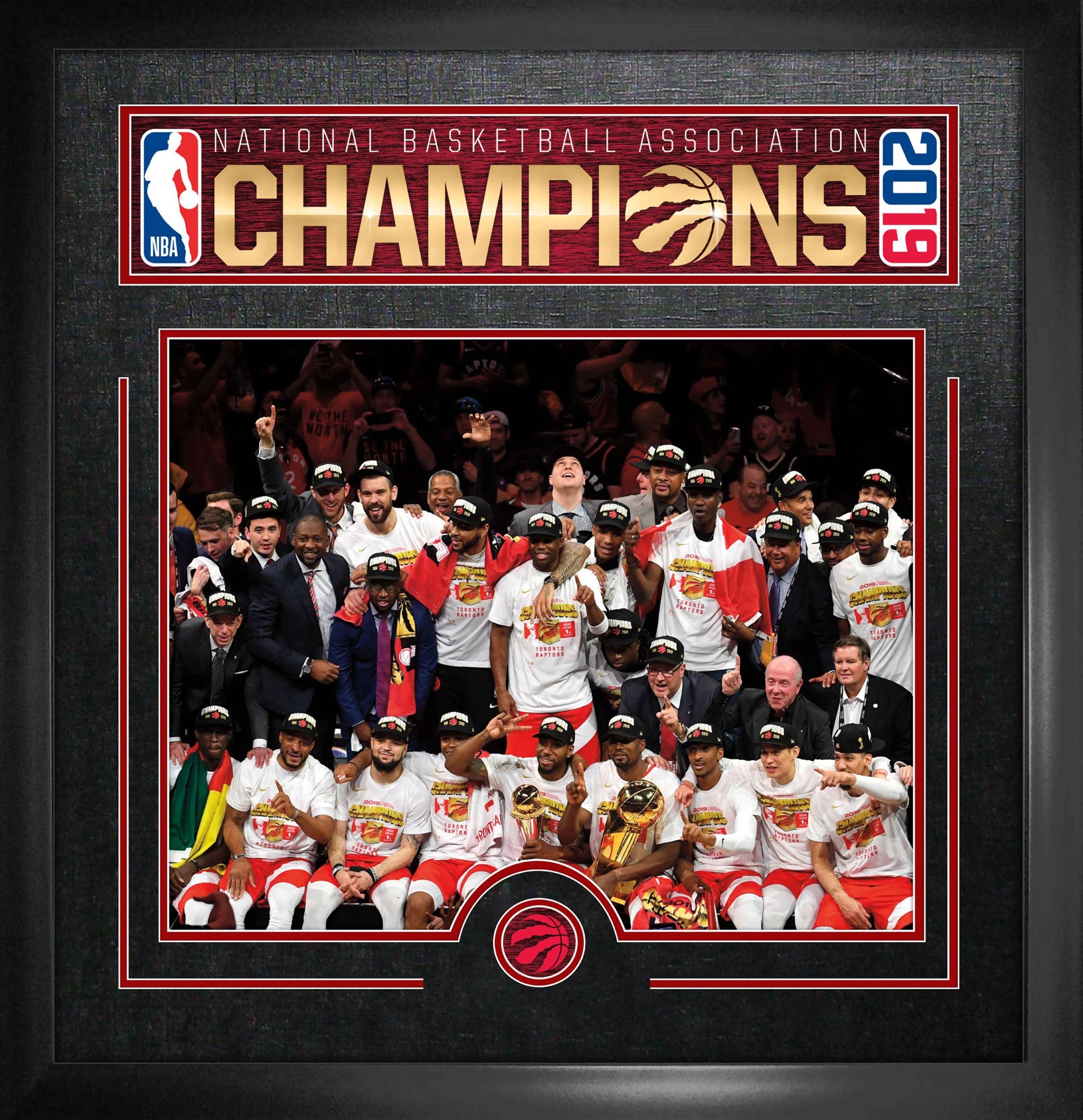 Add a piece of Toronto basketball history with this framed championship piece. This frame features a team photo of the players and staff posing with the Larry O'Brien Trophy. At the top of the frame is a print that highlights the Toronto Raptors as the 2019 NBA Champions. Since the team was established in 1995, the team was still seeking their first ever NBA Championship title and Finals appearance. After 24 years and a memorable 2019 playoff run, the team who plays in the city referred to as the six, won in game six. Perfect for any home or office. Hang a piece of Canadian heritage history with this championship frame. Professionally framed in Canada. Finished frame size: 31x35. Finished Size: 1x31x35"