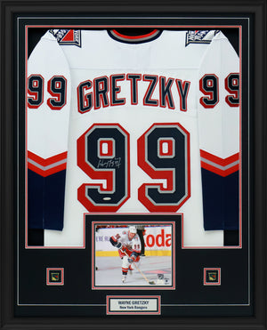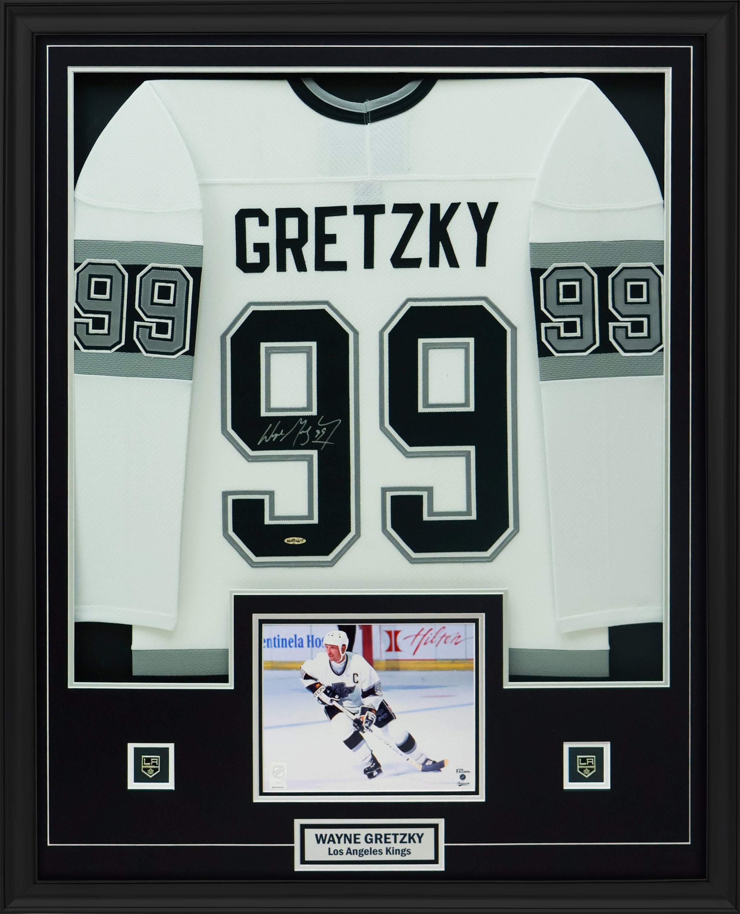 This Wayne Gretzky Los Angeles Kings jersey with name and numbers professionally sewn on comes personally autographed by Wayne Gretzky before being professionally framed. This Jersey Framed is officially licensed by the NHL and comes with a certificate of authenticity and hologram from Upper Deck to ensure authenticity. Signatures may vary. Made in Canada. Jersey size may vary. Finished Size: 34x42"