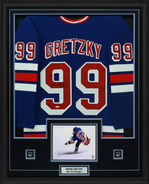 This Wayne Gretzky St. Louis Blues jersey with name and numbers professionally sewn on comes personally autographed by Wayne Gretzky before being professionally framed. This Jersey Framed is officially licensed by the NHL and comes with a certificate of authenticity and hologram from Upper Deck to ensure authenticity. Signatures may vary. Made in Canada. Jersey size may vary. Finished Size: 34x42"