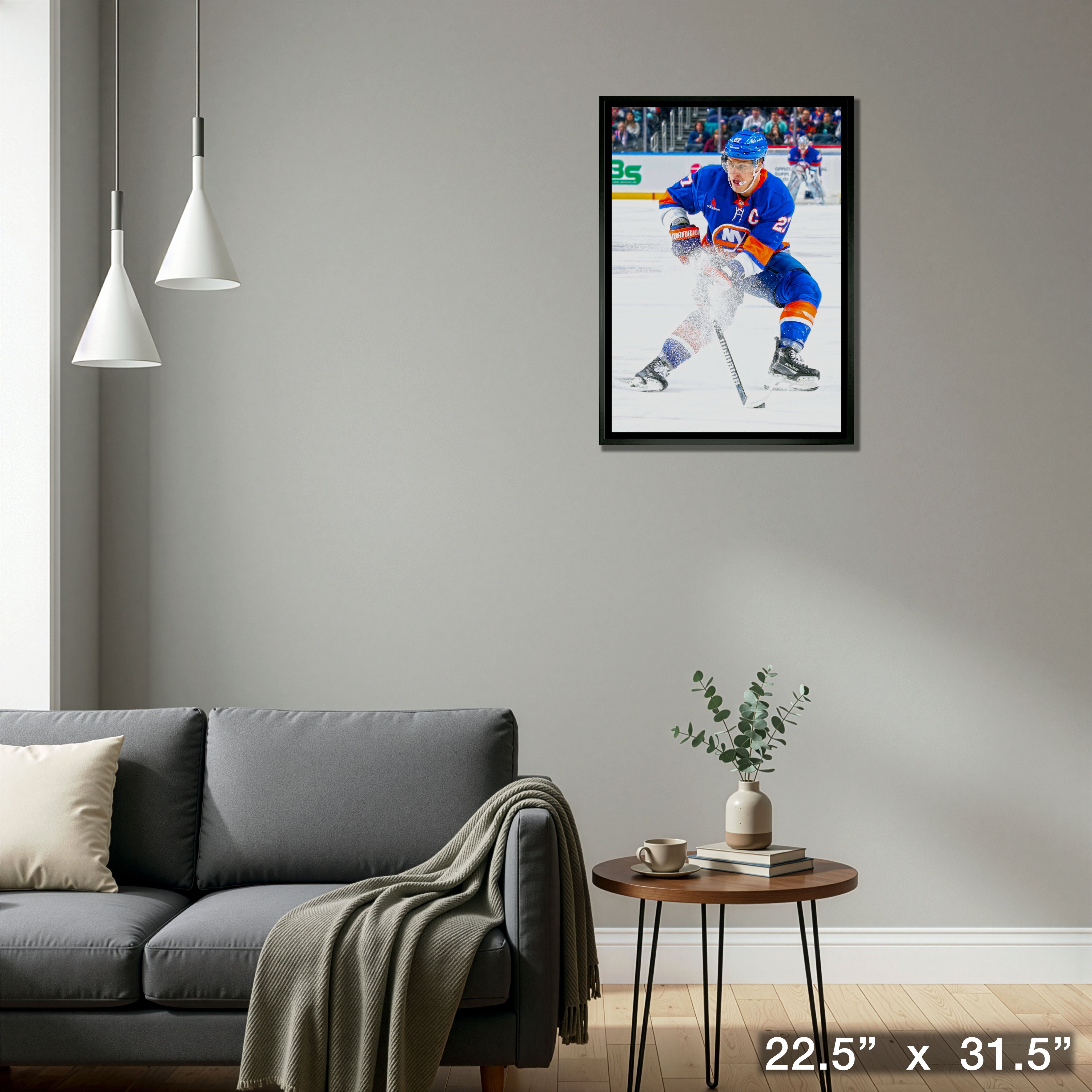 This image of Anders Lee is printed on high quality art canvas and then professionally stretched and framed. This canvas is officially licensed by the National Hockey League (NHL) and National Hockey League Players Association (NHLPA). Made in Canada.. Finished Size: 22.5 x 31.5"