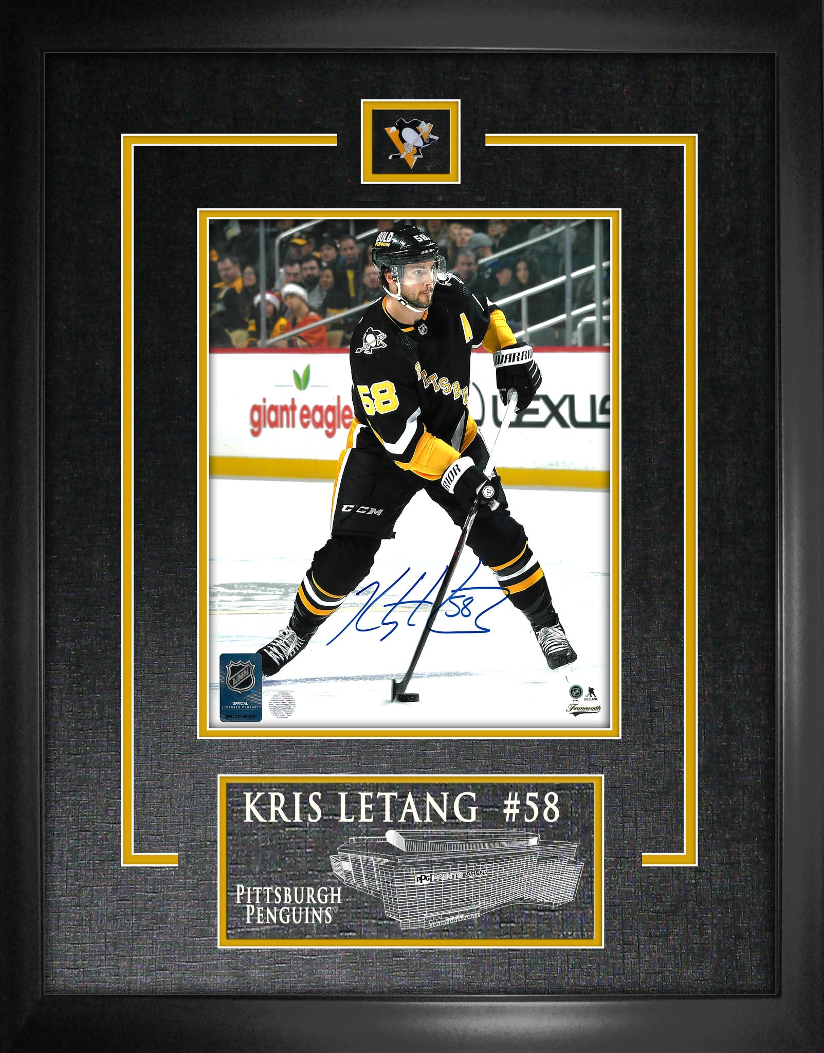 This photo of Kris Letang comes personally autographed by Kris Letang before being professionally framed. This photo is officially licensed by the National Hockey League (NHL) and National Hockey League Players Association (NHLPA) and comes with a certificate of authenticity and hologram from Frameworth to ensure authenticity. Signatures may vary. Finished Size: 16 x 20"