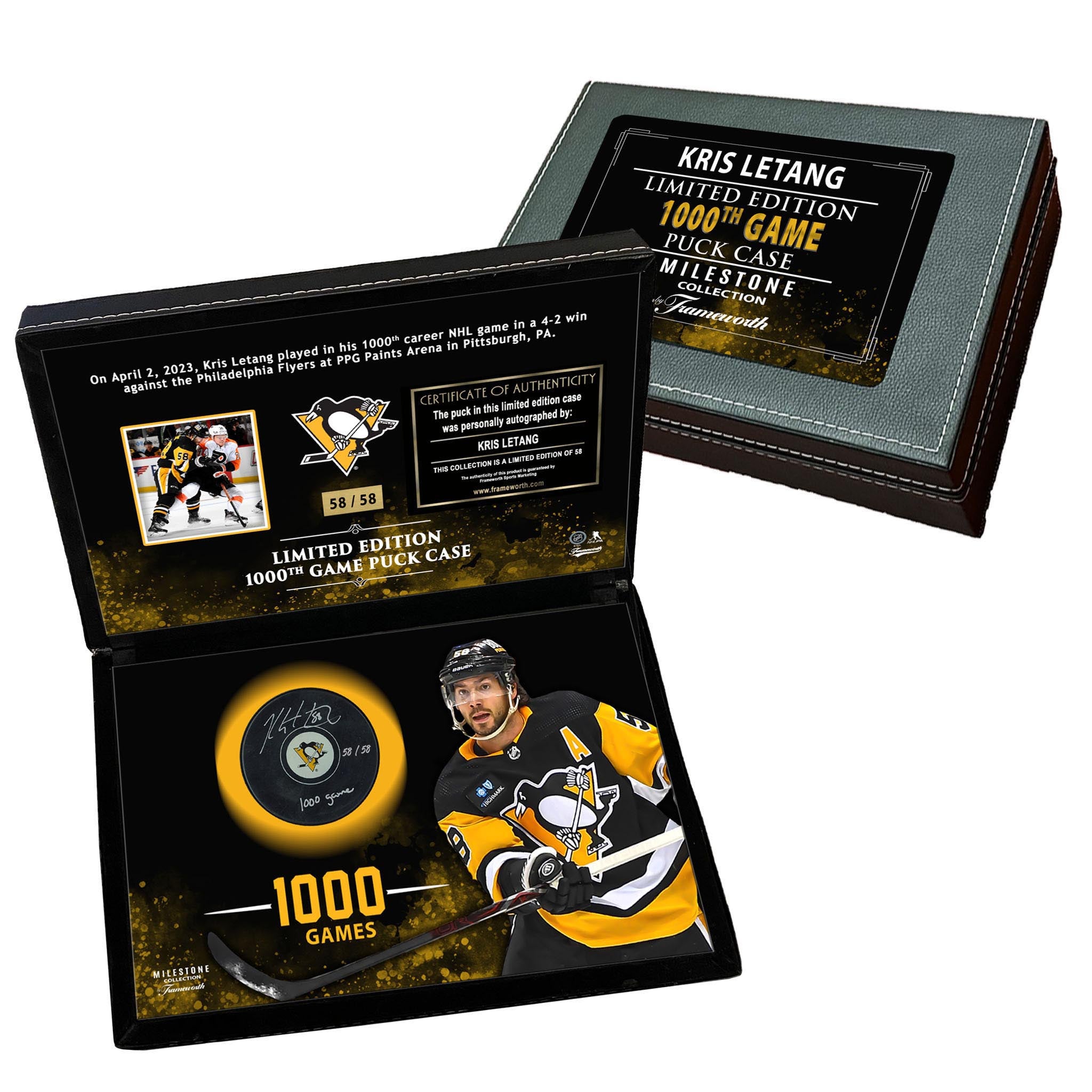 Product: Kris Letang Signed Puck in Deluxe Case Pittsburgh Penguins Insc "1000 game" LE of 58