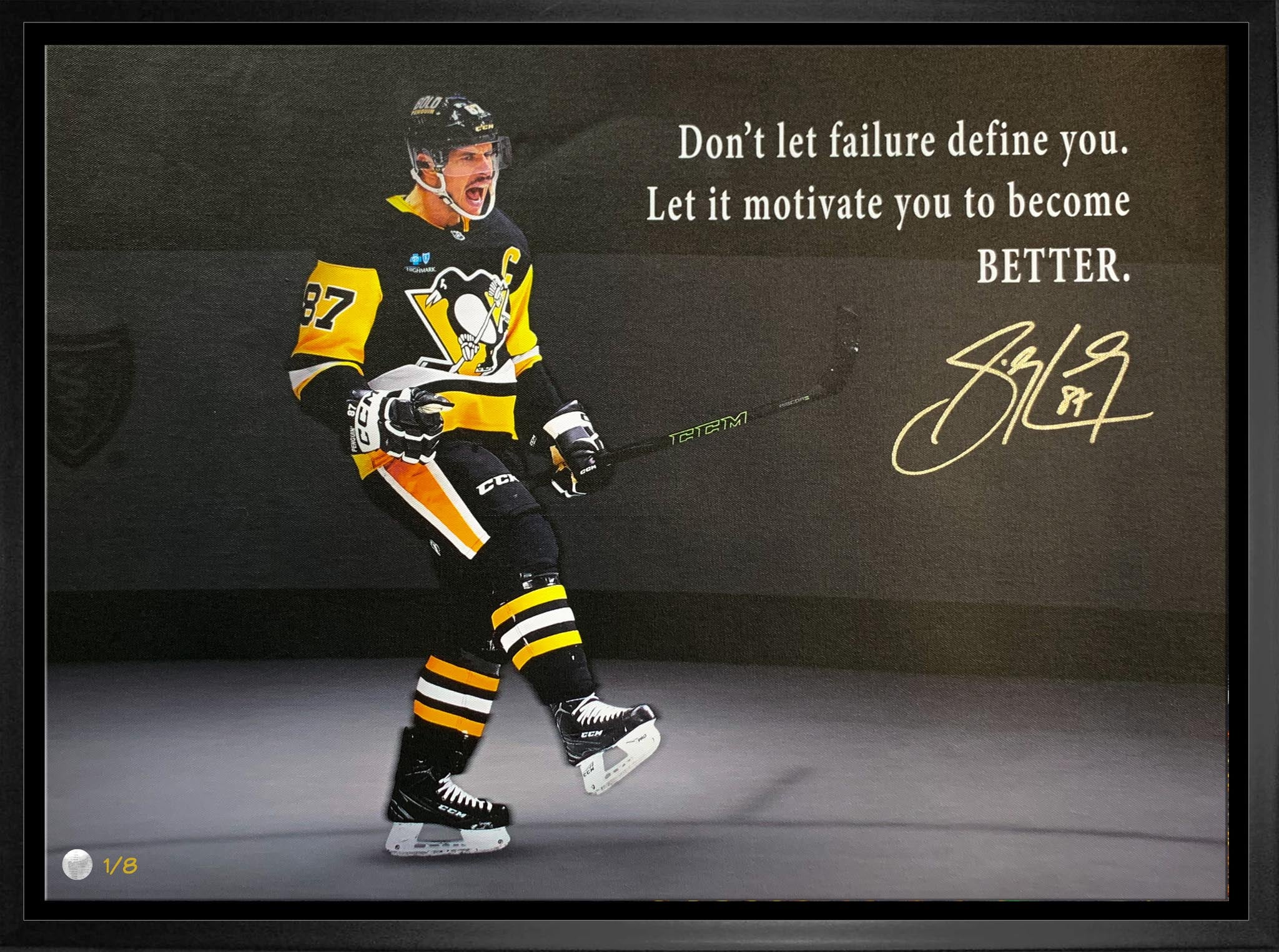 Harness the champion's mindset with this signed 20x29 action canvas featuring Sidney Crosby's powerful philosophy: "Don't let failure define you. Let it motivate you to become BETTER." This professionally framed piece captures Crosby in explosive celebration, personally autographed alongside words that reveal the mentality behind his resilience and success. Limited to just 8 pieces worldwide, this Quote Edition offers collectors an extraordinarily rare fusion of dynamic action photography and the wisdom that has driven Crosby through every challenge to ultimate triumph.