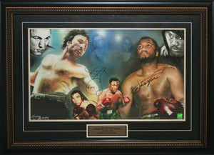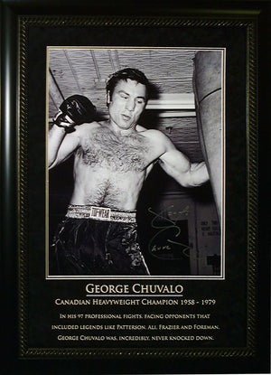 This limited edition piece was hand signed by George Chuvalo. Includes descriptive plate and matting with decorative v-groove inlay. Certificate of authenticity included. FINISHED SIZE 28x26"