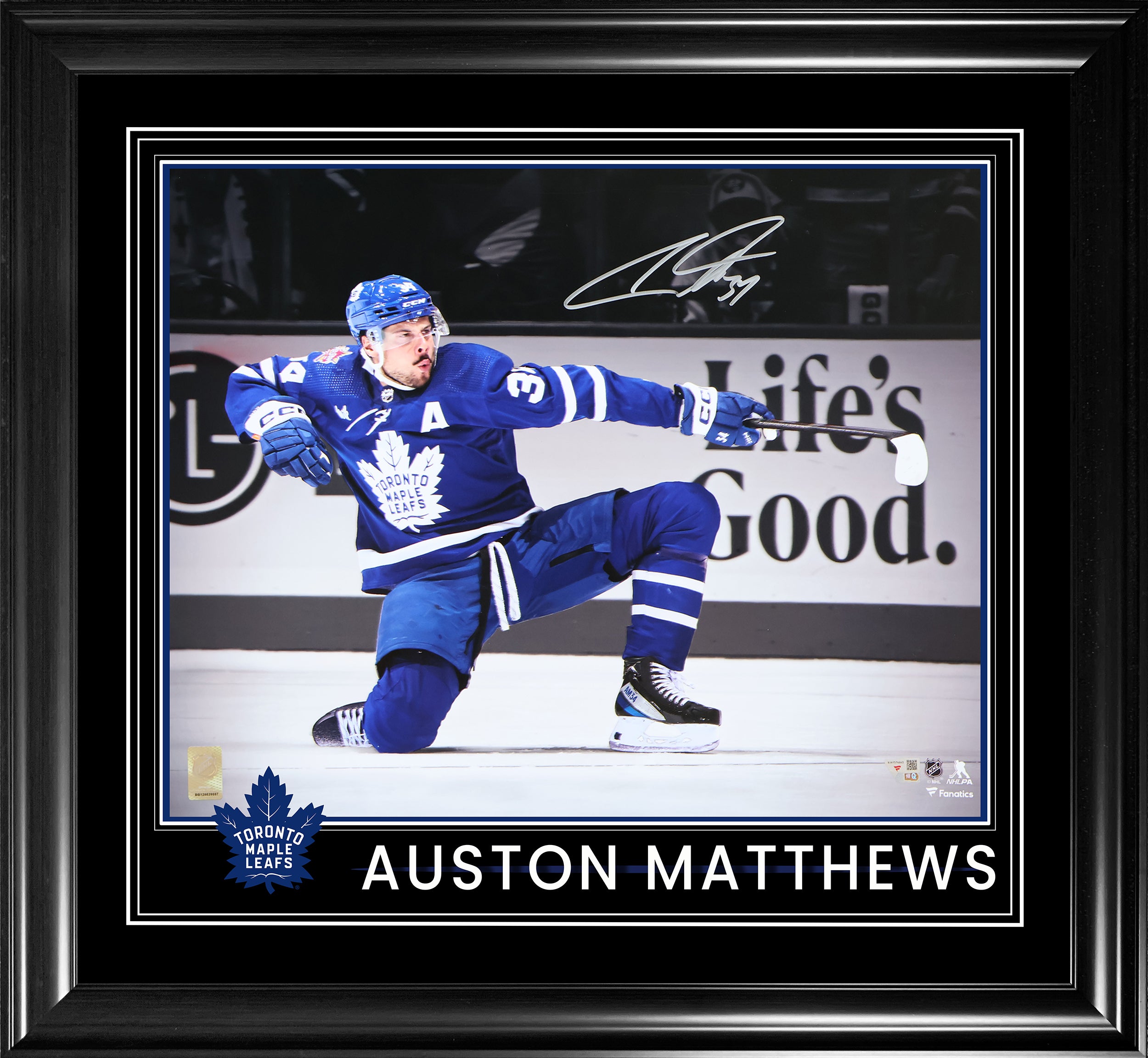 Auston Matthews Toronto Maple Leafs Signed 16x20 One Knee Celebrating Spotlight Photograph Framed