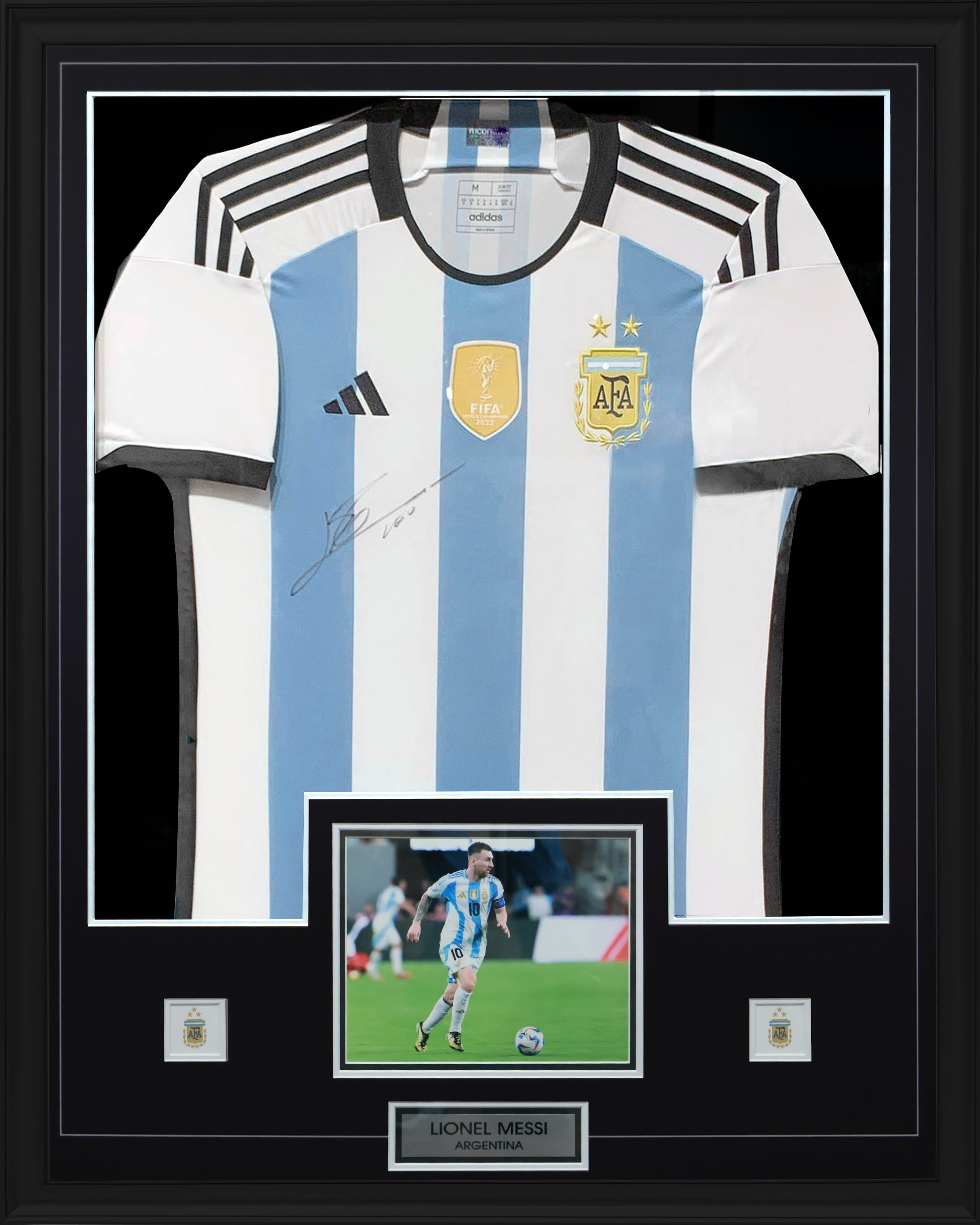 Featuring the updated Argentina crest with three stars commemorating their World Cup victories, this jersey has been professionally framed with an action photo of Messi in the tournament. The elegant black frame with Argentina blue accents creates a museum-quality display that preserves this historic piece for generations.