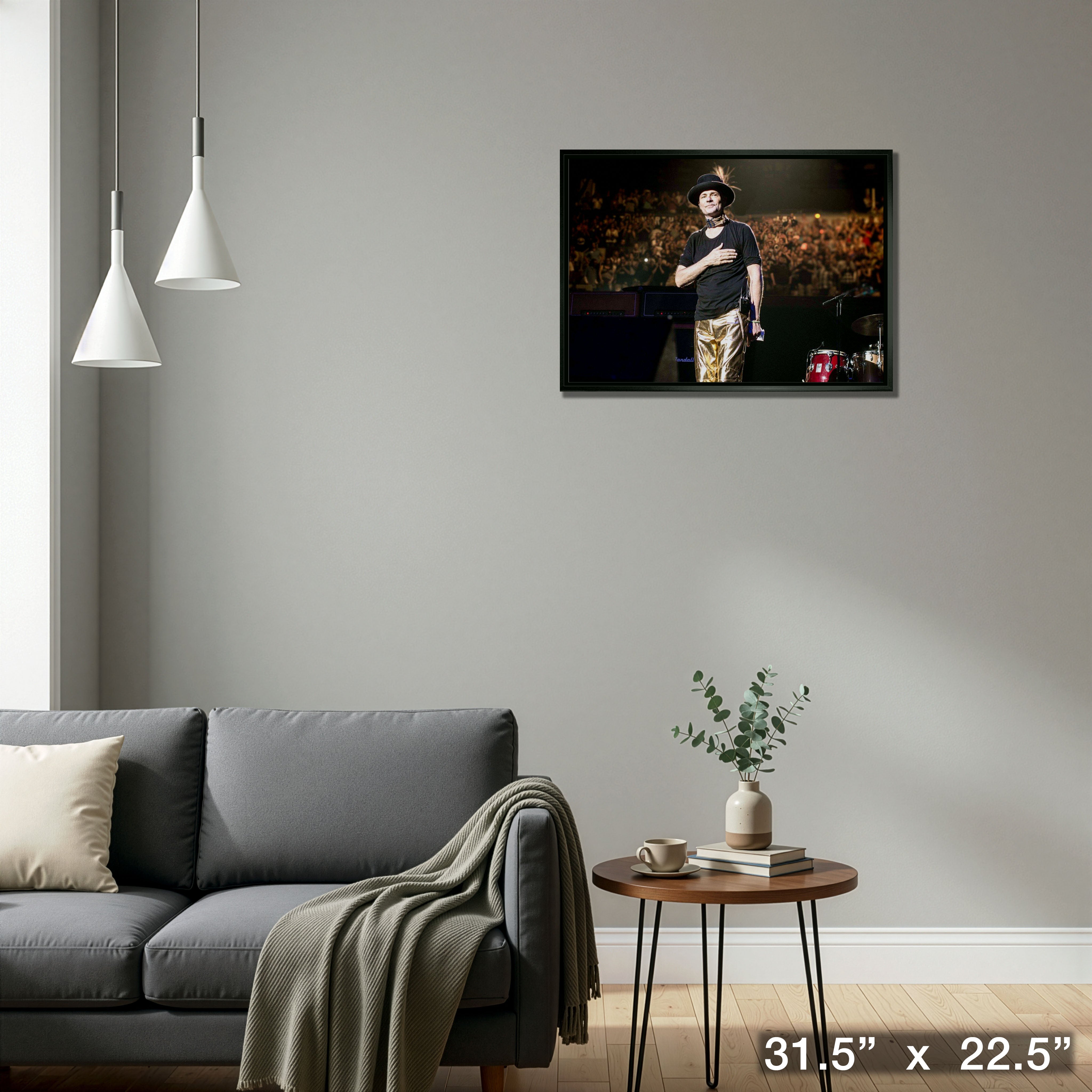 This framed 20x29 canvas is an image of the lead singer Gordon Downie from the band The Tragically Hip, performing during one of his final shows with his band. The image features Gordon Downie with his hand on his heart, to express his gratitude to the fans who attended the show. This image would have been taken during one of their final shows they ever played. In 2016, The Tragically Hip went on their final tour entitled Man Machine Poem, hitting fifteen different cities across Canada. The tour was announced during May of 2016, following the announcement and diagnosis of lead singer Gordon Downie’s brain cancer. When the tour was created they ensured that a portion of the proceeds be donated to the Sunnybrook Foundation. As the tour approached its final show in Kingston, Ontario, the concert was broadcasted live across Canada to allow Canadians to experience and enjoy the concert from their living rooms. Gordon Downie was not only known for his time within the band, but was a true Canadian ambassador. Add a piece of Canadian pop-culture history to your collection. This image has been printed onto a high quality art canvas. The canvas is professionally stretched and mounted on to the back of a 1" deep wooden frame and then set in Frameworth's renowned float-style black framing. This item comes with a certificate of authenticity to prove it is an officially licensed The Tragically Hip collectible. Frameworth is the only official licensee of Tragically Hip framed collectibles. Finished Size: 31.5 x 22.5"