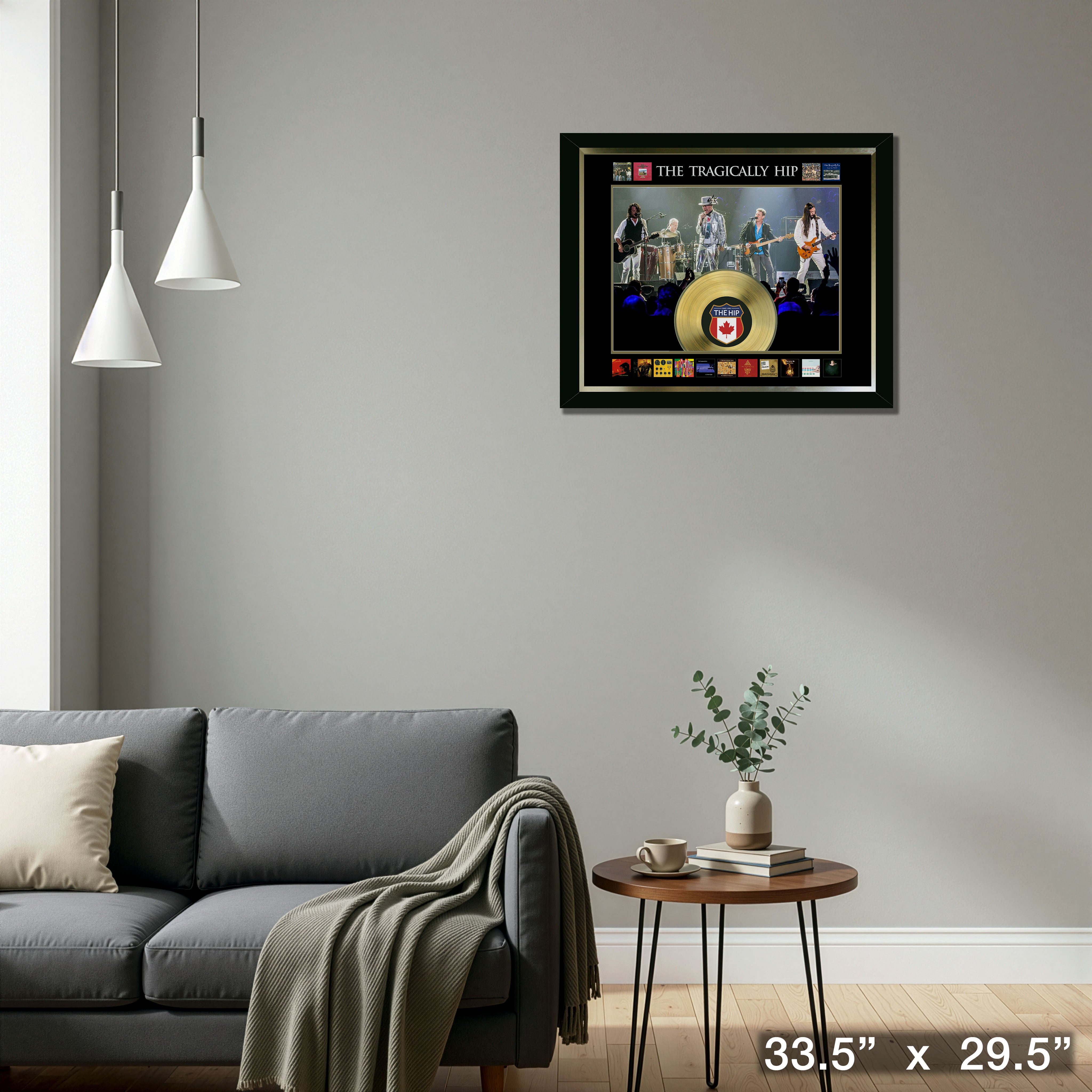 Bold, celebratory and distinctly Canadian — this framed album collage places The Tragically Hip center stage with a gleaming gold LP and a parade of album art that traces the band’s career at a single, dramatic glance.