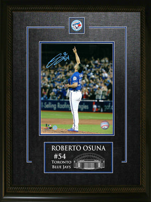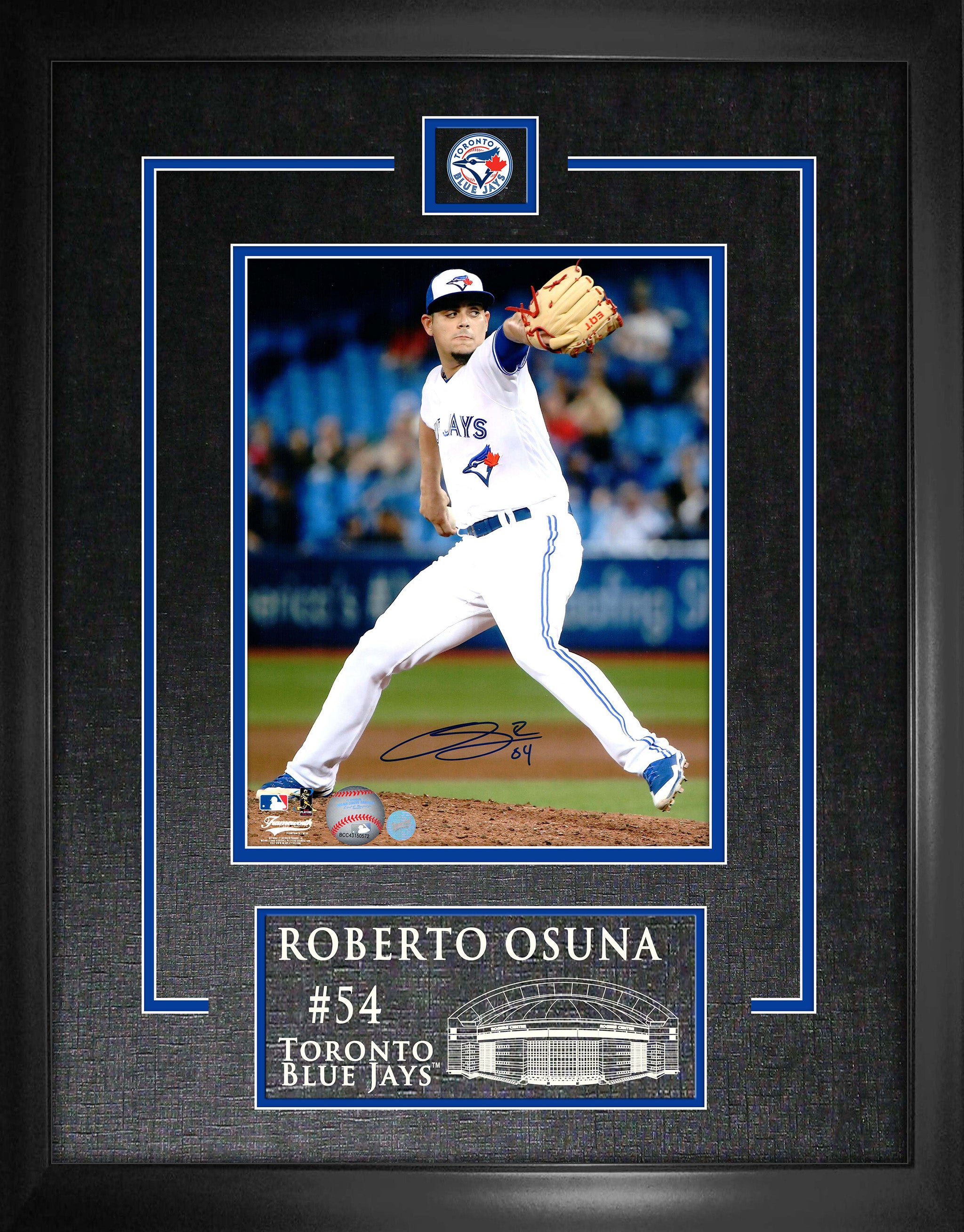This professionally framed 8x10 action photo captures Toronto Blue Jays pitcher Roberto Osuna mid-pitch in his white home jersey. Hand-signed by Osuna, the display features an etched mat with his name, number (#54), team logo, and Rogers Centre artwork. Each autograph comes with a Frameworth hologram and certificate of authenticity. Finished size: 18" x 22". A must-have collectible for Blue Jays fans and baseball memorabilia collectors.