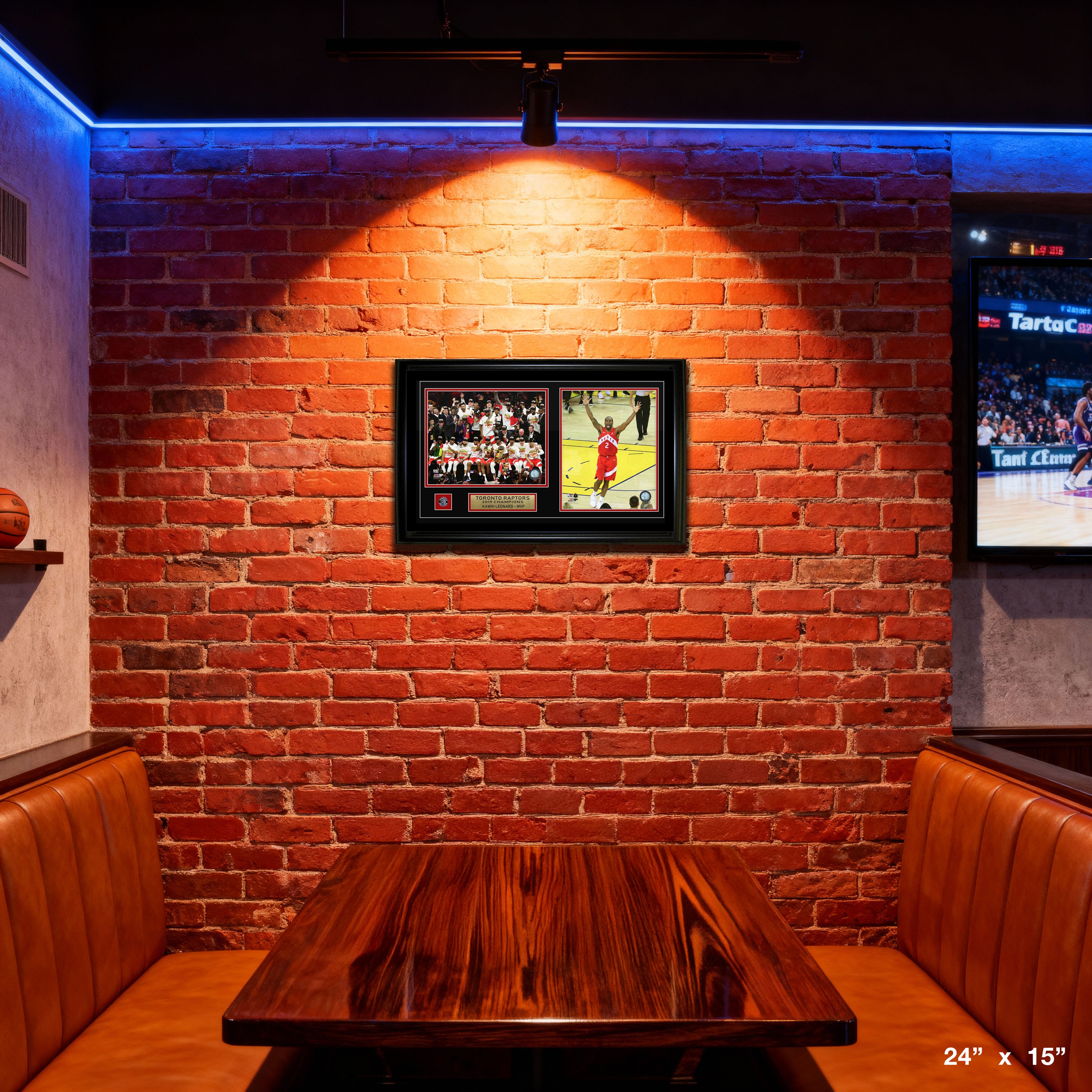 This frame features two 8x10 photos from the 2019 NBA Finals. On the left side of the frame is a team photo of the players and staff posing with the championship trophy. To the right is a timeless photo of Kawhi Leonard with his arms raised in the air celebrating, as the Toronto Raptors secured the 2019 NBA Championship. Below the photo is a Toronto Raptors pin and a plate highlighting Kawhi as MVP and the Toronto Raptors as 2019 NBA Champions. After spending seven seasons with the San Antonio, Leonard was traded in the off-season to Toronto, where he would help lead the team to its first ever championship. During the 2019 NBA playoffs career Leonard averaged 30 points and was 49% from the field goal. This significantly helped the Raptors. Since the team was established in 1995, the team was still seeking their first ever NBA Championship title. After 24 years and a memorable 2019 playoff run, the team who plays in the city referred to as the six, won in game six. Perfect for any home or office. Hang a piece of Raptors finals history with this Kawhi Leonard MVP frame. Professionally framed in Canada. Frame Size: 16x28”