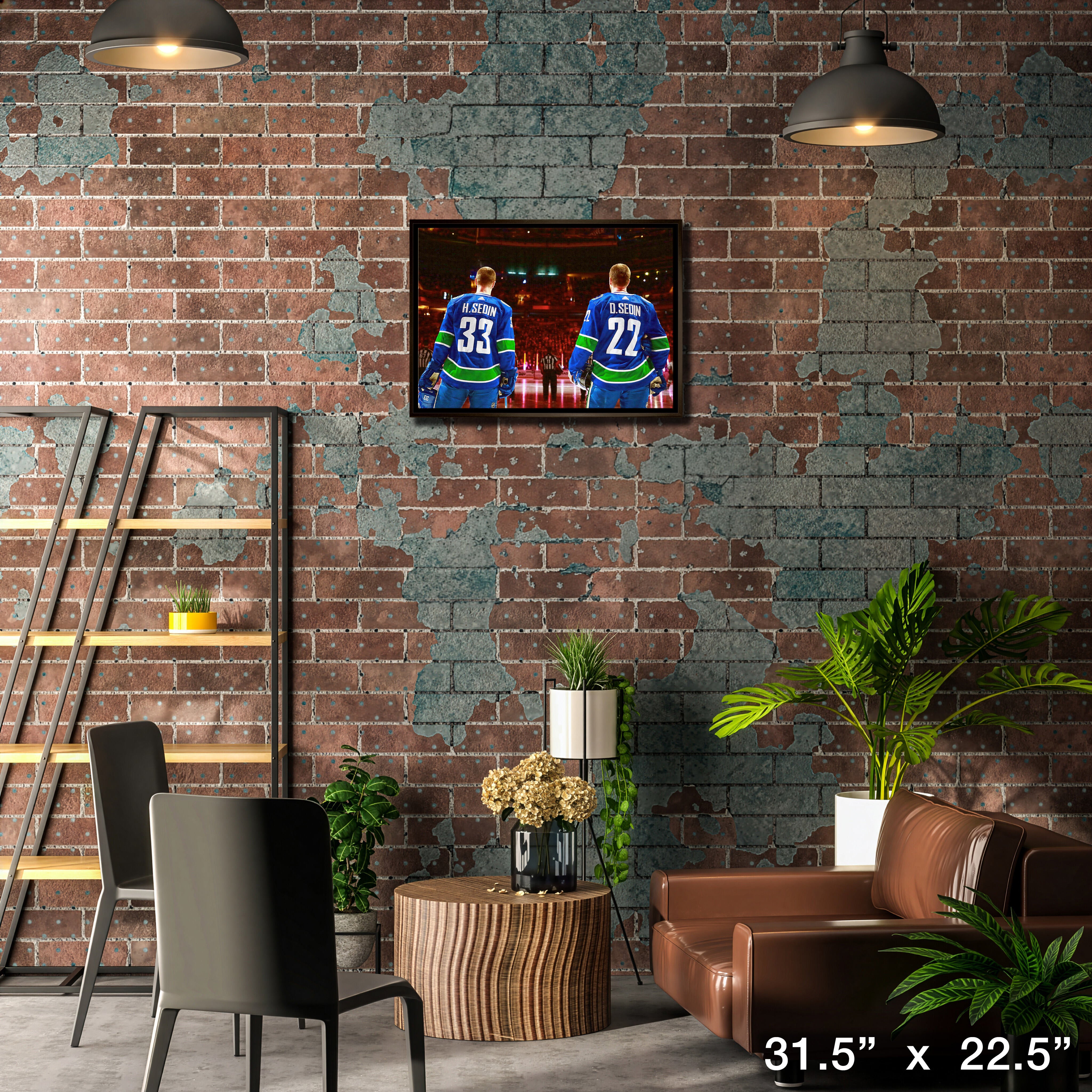 This image of Henrik Sedin and Daniel Sedin is printed on high quality art canvas and then professionally stretched and framed. This canvas is officially licensed by the National Hockey League (NHL) and National Hockey League Players Association (NHLPA). Made in Canada.. Finished Size: 31.5 x 22.5"