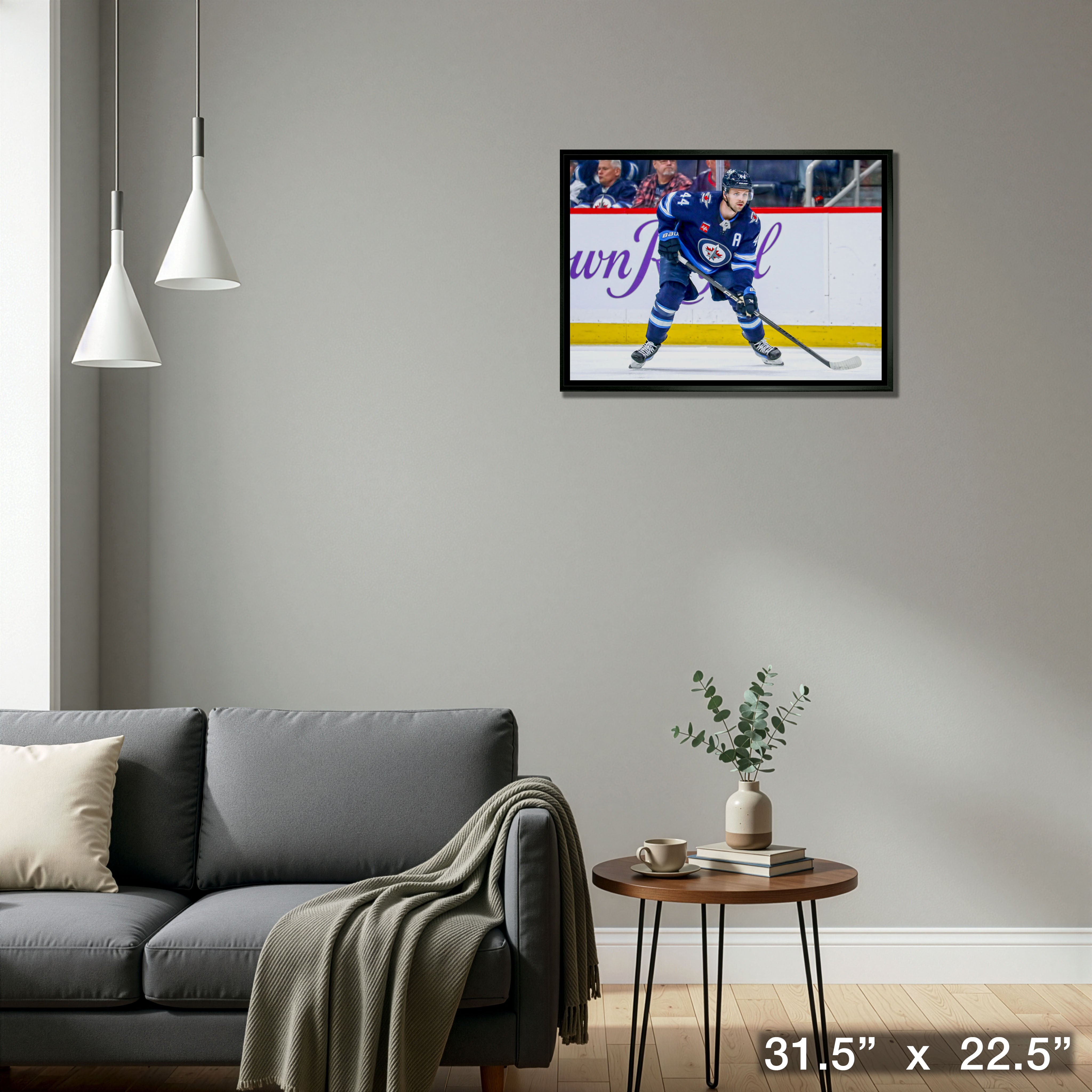 This image of Josh Morrissey is printed on high quality art canvas and then professionally stretched and framed. This canvas is officially licensed by the National Hockey League (NHL) and National Hockey League Players Association (NHLPA). Made in Canada.