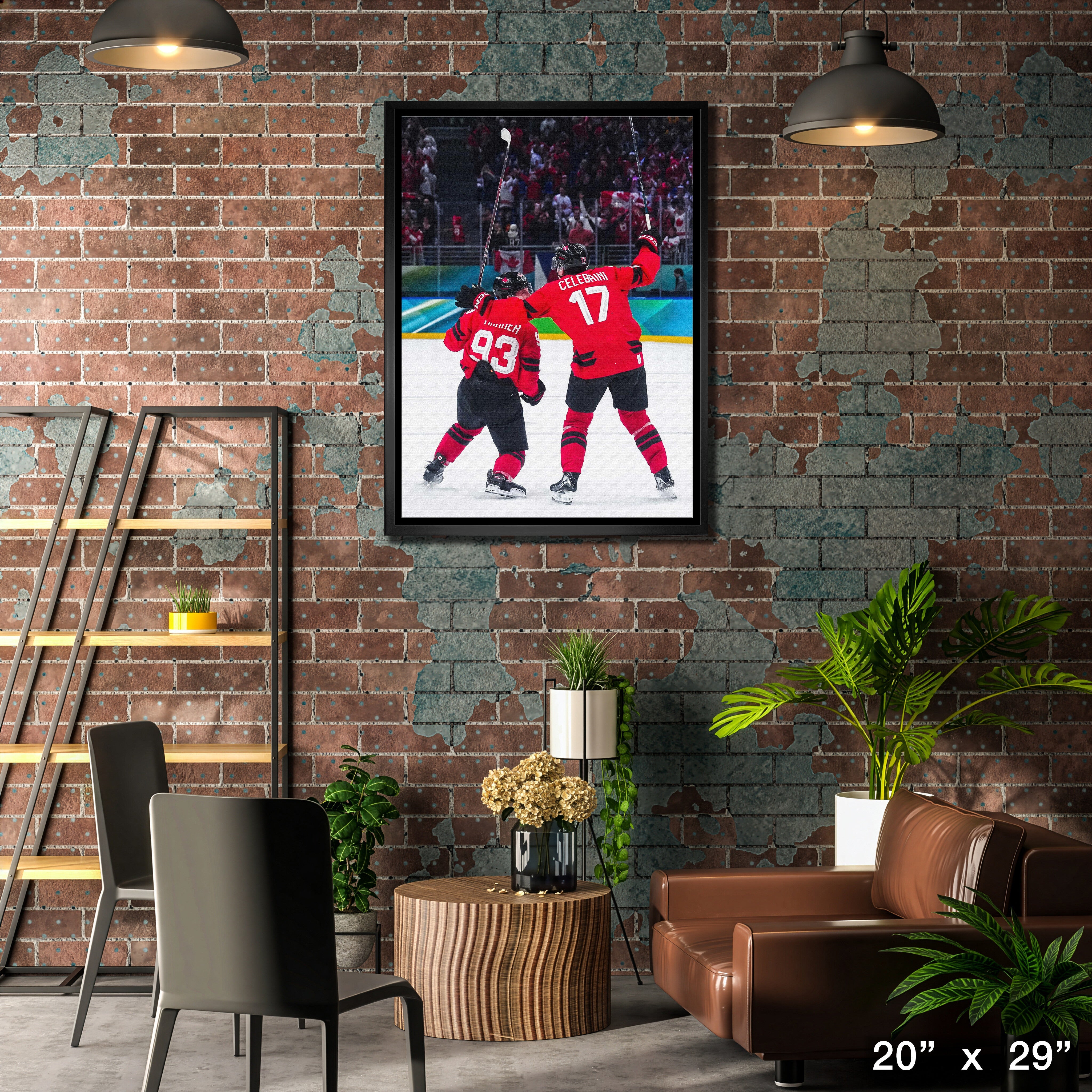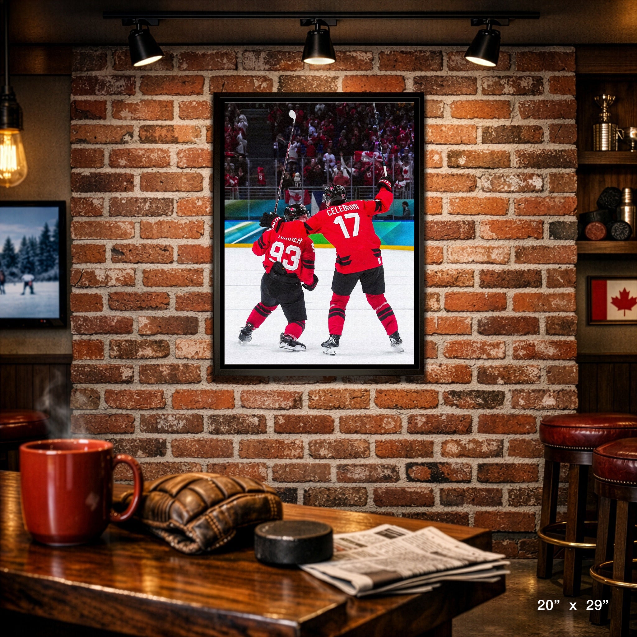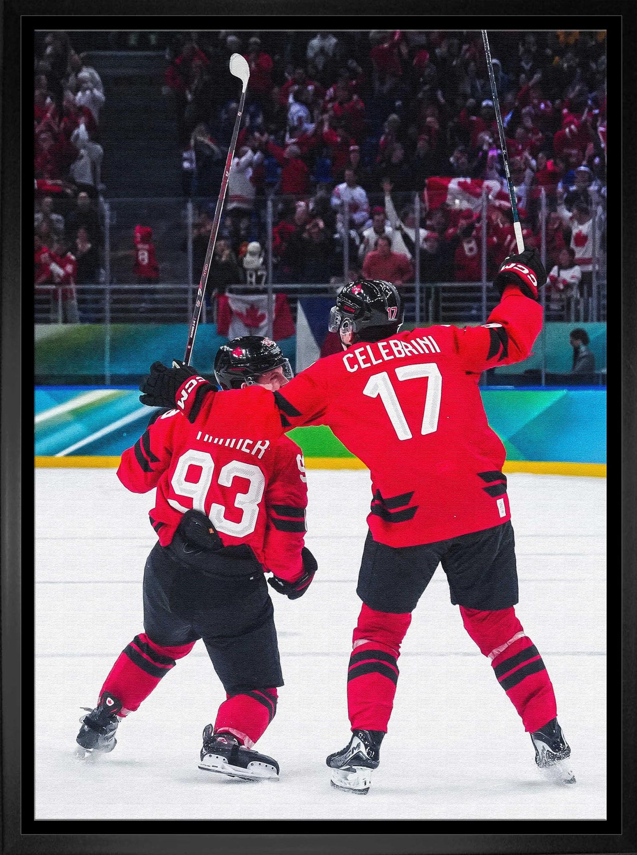 Macklin Celebrini and Mitch Marner 20x29 Canvas Framed Hockey Canada 2025 OT Celebration Quarter Finals-V