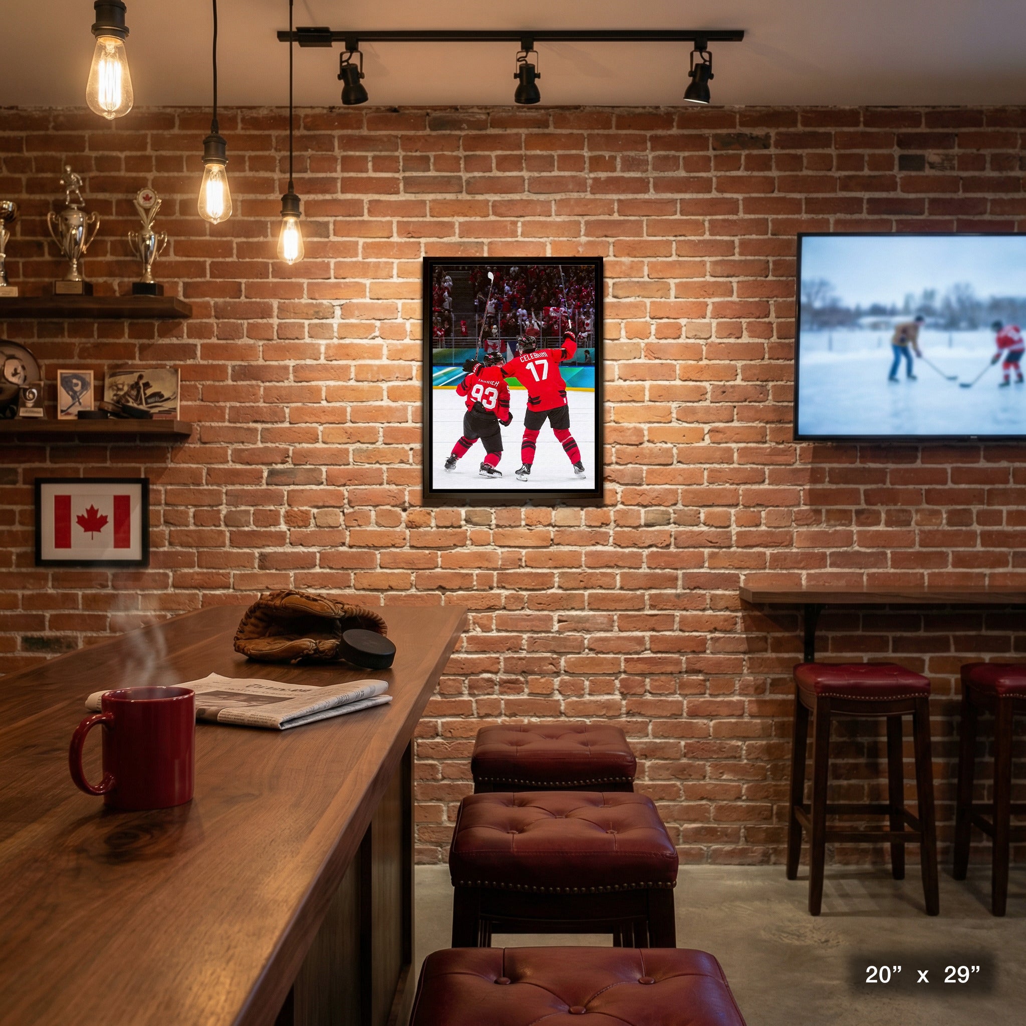 Macklin Celebrini and Mitch Marner 20x29 Canvas Framed Hockey Canada 2025 OT Celebration Quarter Finals-V is backordered and will ship as soon as it is back in stock.