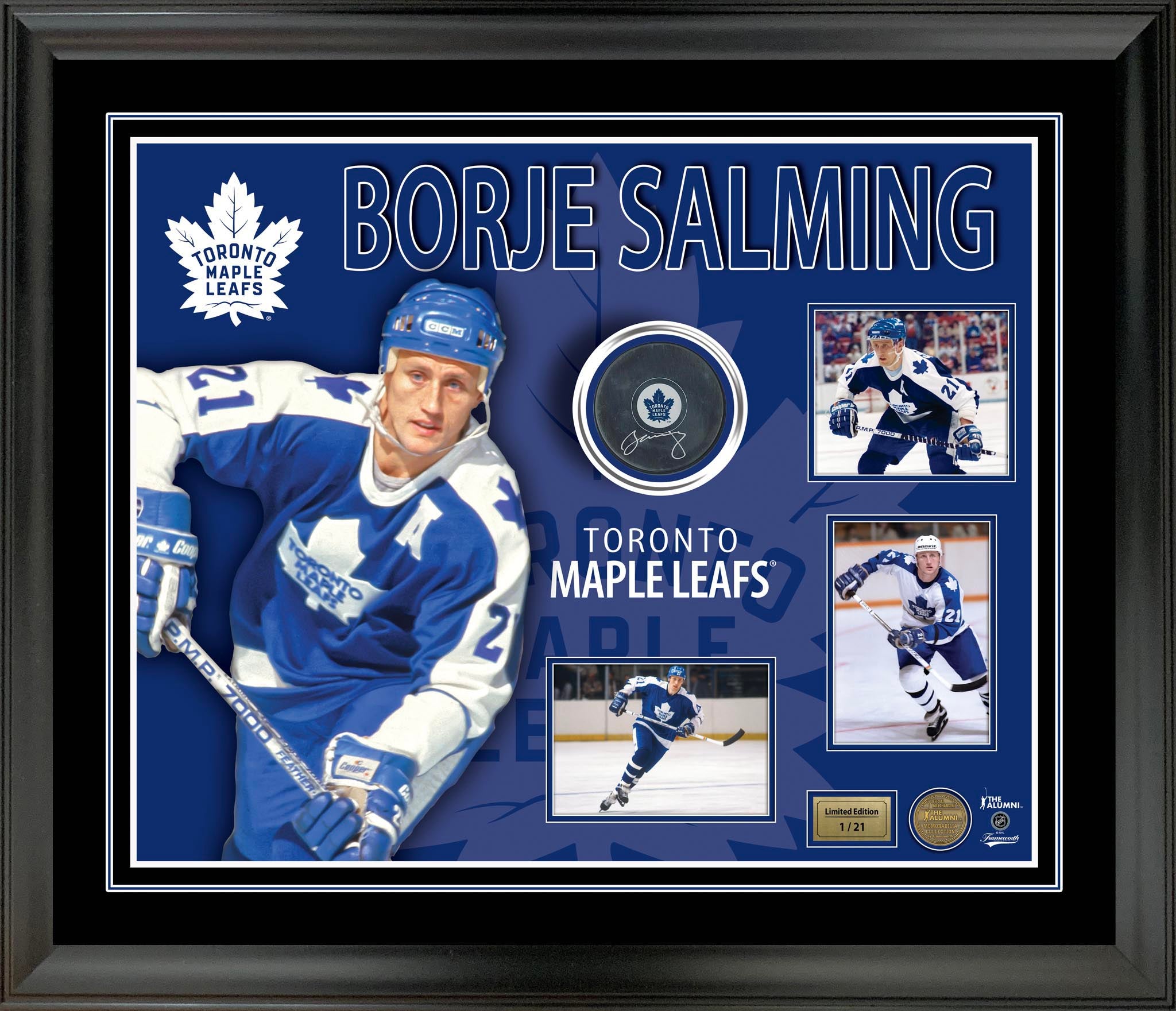 Borje Salming Signed Puck in a PhotoGlass Frame Maple Leafs L/E 21