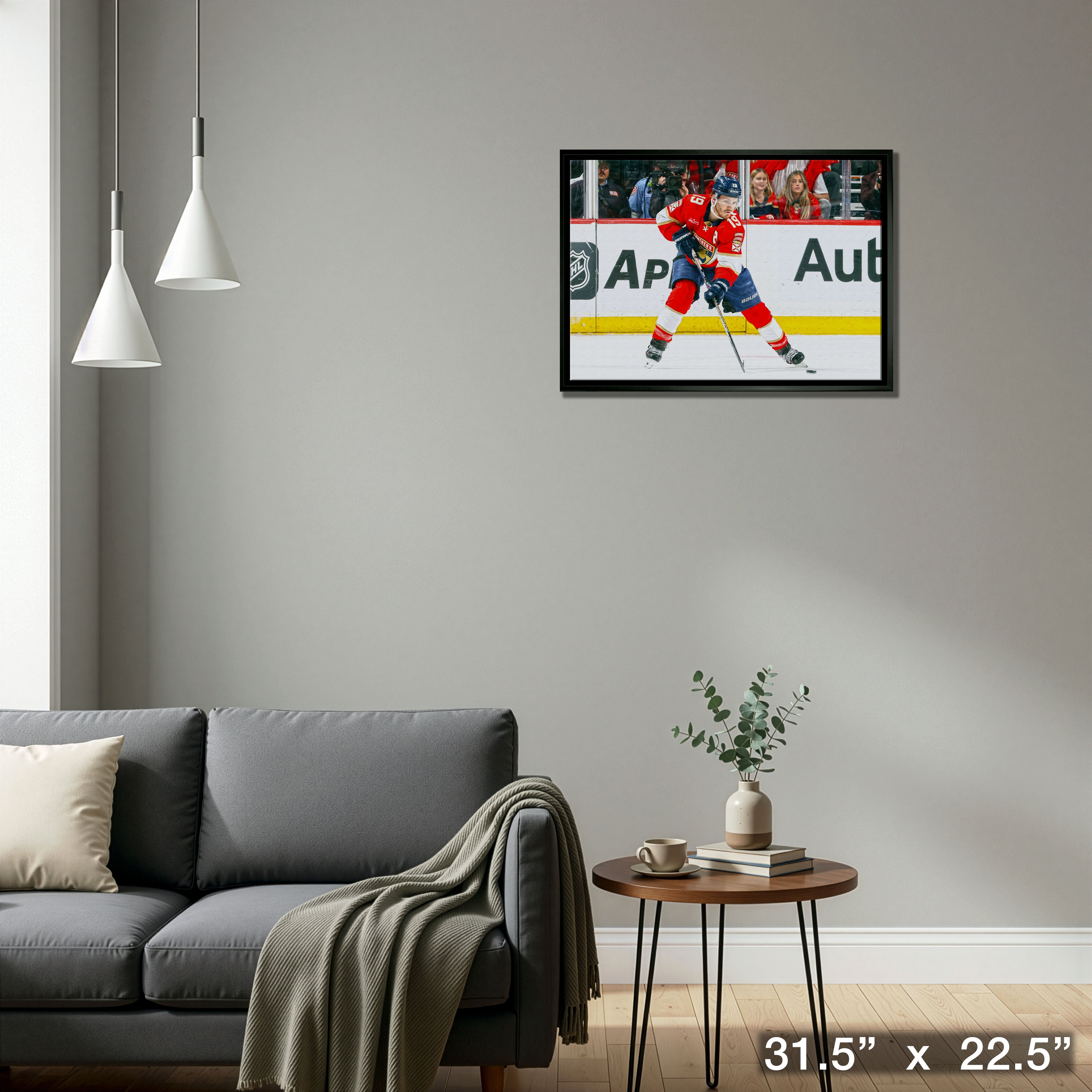 This image of Matthew Tkachuk is printed on high quality art canvas and then professionally stretched and framed. This canvas is officially licensed by the National Hockey League (NHL) and National Hockey League Players Association (NHLPA). Made in Canada. Finished Size: 31.5 x 22.5"