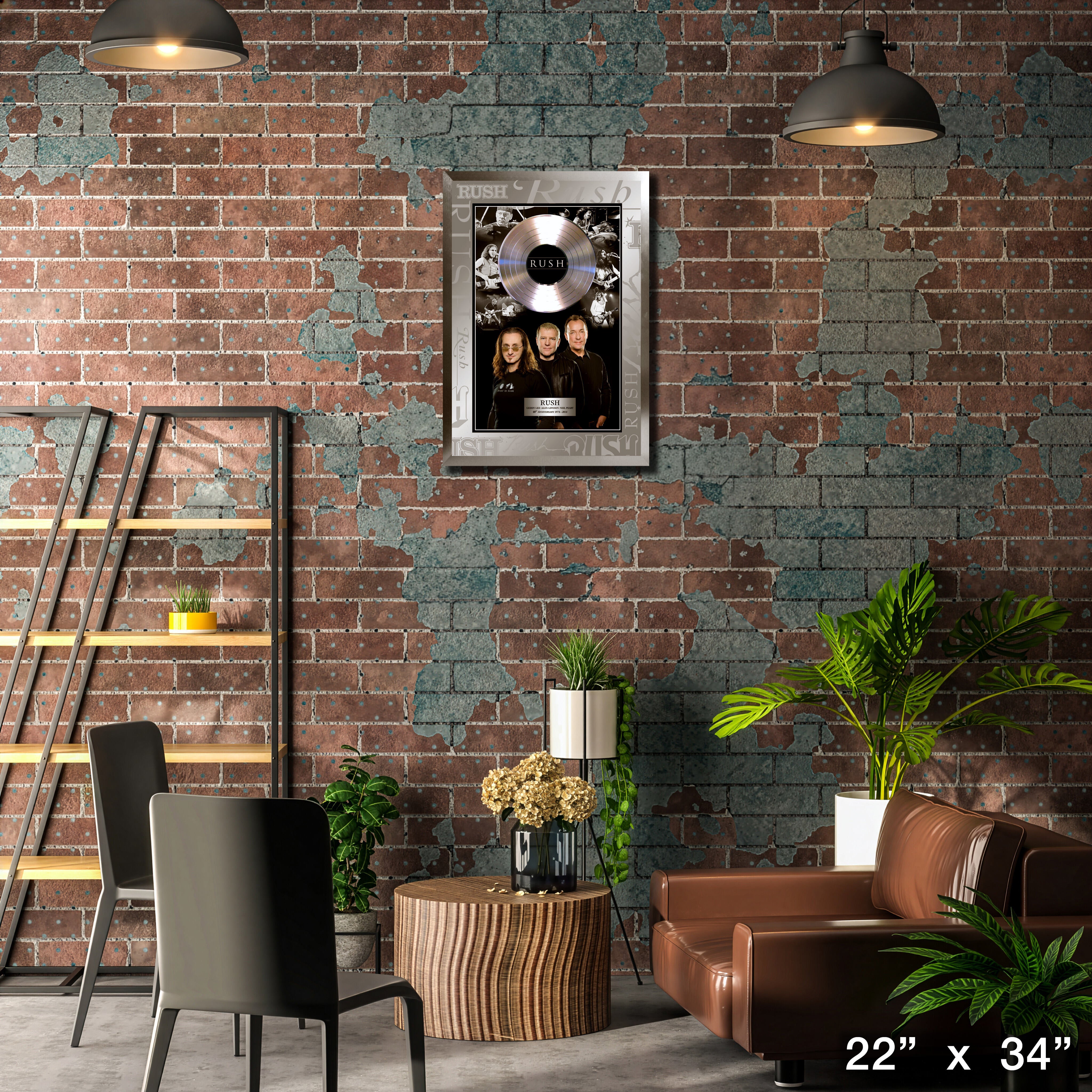 This striking black-and-white photo collage pairs museum-style portraiture with a mounted platinum LP and engraved descriptive plate, creating a dramatic tribute to Rush that reads like a chapter from rock history.